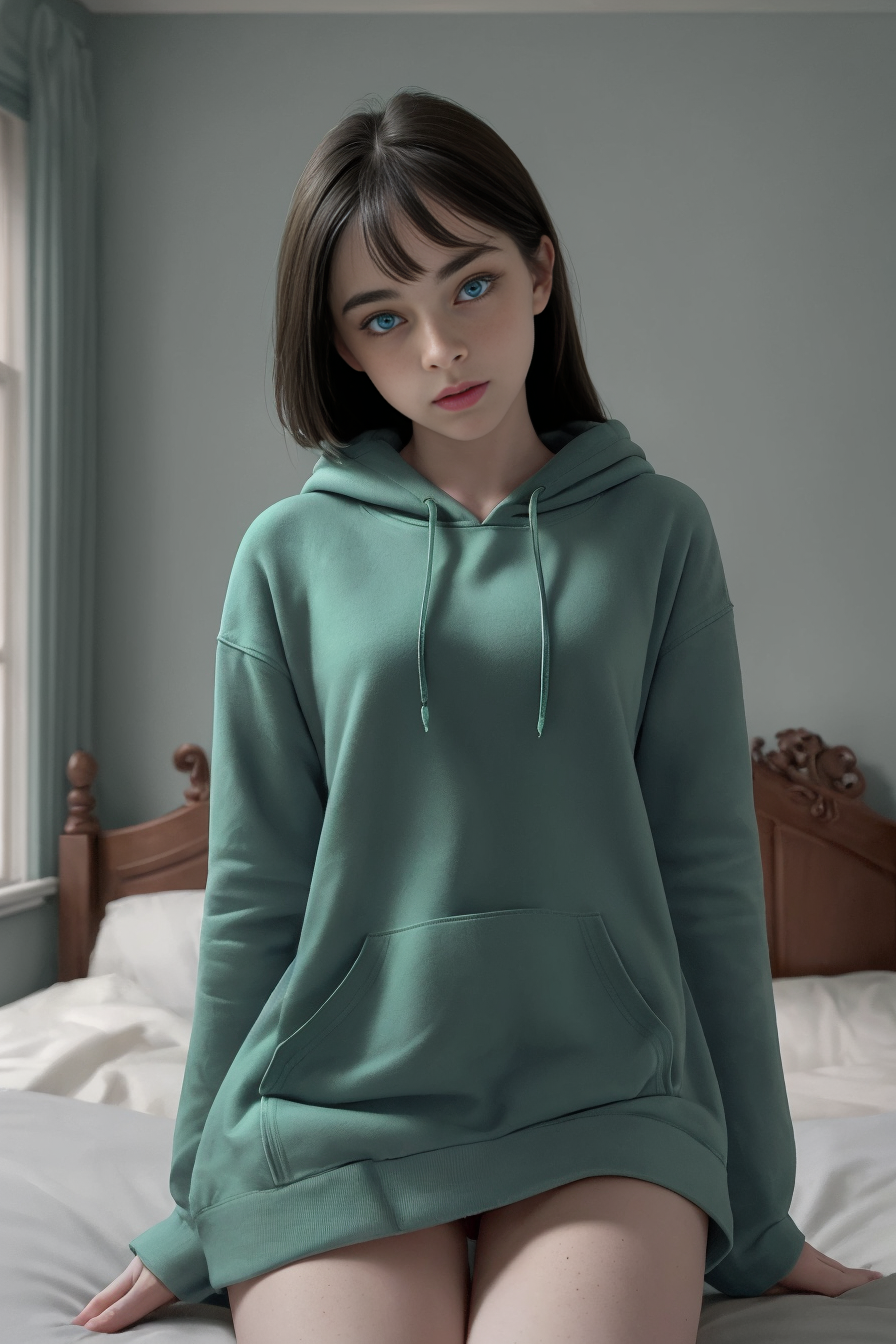 (best quality, ultra-detailed, masterpiece: 1.4), cinematic lighting, HDR, 8k resolution, 2.5d render, detailed background, beautiful face, large green eyes, detailed eyes, one girl, pubic hair, cute, freckled face, freckles, dark brown hair, pale skin, blush, blue hoodie, bottomless, exzessive pubic hair, lying on bed, <lora:more_details:0.6>, small nose, <lora:female pubic hair3:1>,