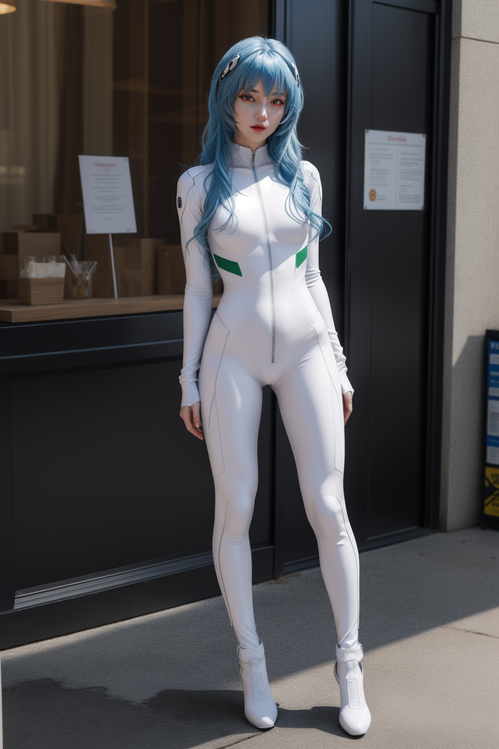 <lora:add_detail:0.5> (1girl, photorealistic,masterpiece, best quality, intricate), amused, full body, seductive pose, rei ayanami, blue hair, long hair, (red eyes:1.5),bodysuit, headgear, plugsuit, white bodysuit <lora:reiayanamitest:1>