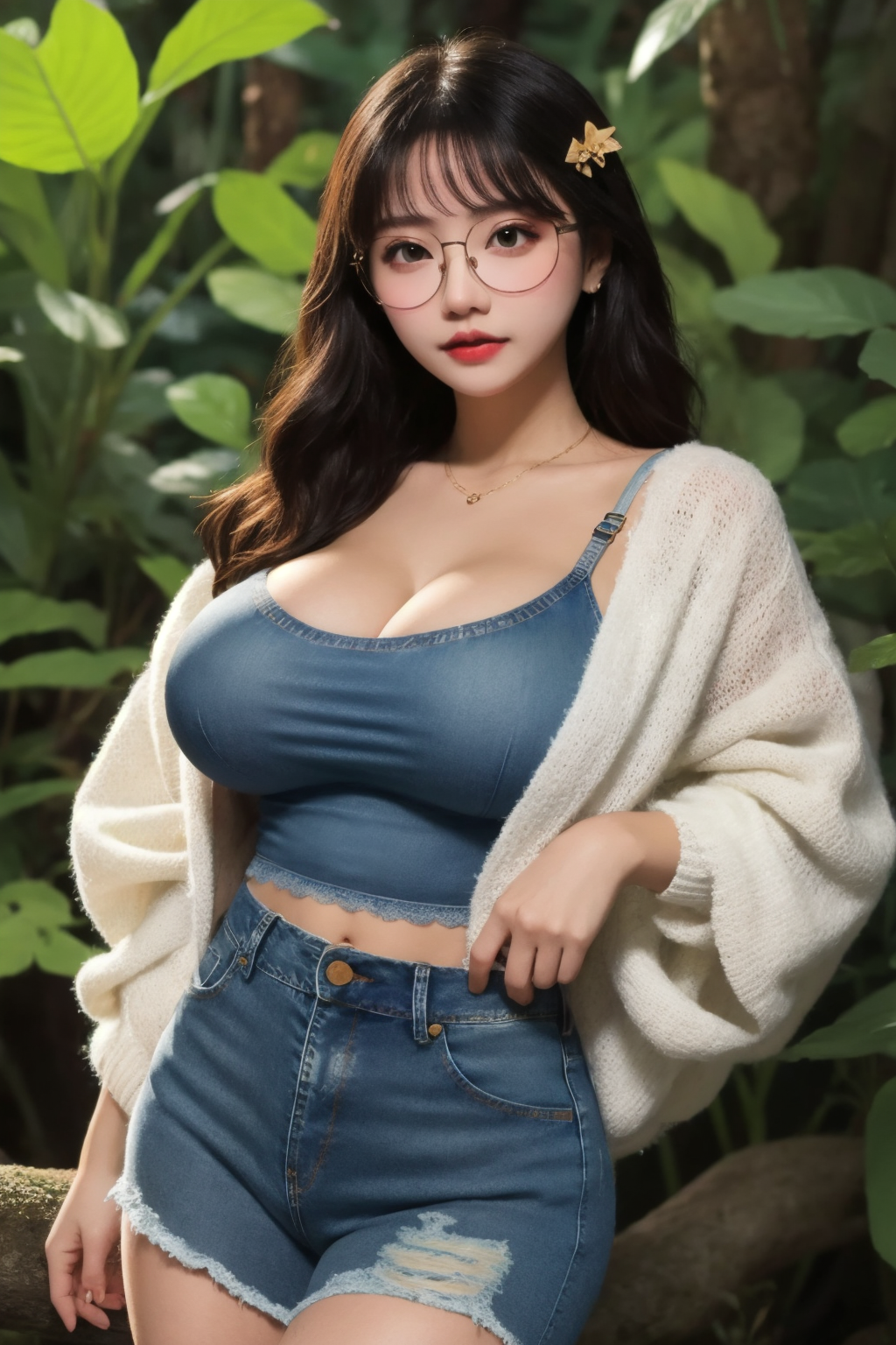 best quality, master piece <lora:hreg:0.7>1girl, glasses, large_breast, cowboy_shot, Fluffy oversized cardigan, Lace camisole top, High waisted jeans, Canvas sneakers, and cute hairpins., Waterfall hidden within a rainforest of gigantic, vibrantly-colored mushrooms