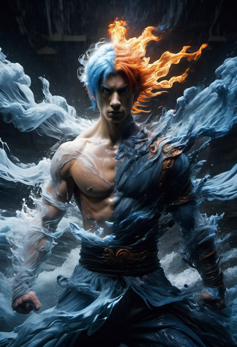 blue water, orange fire, blue and orange hair, wabstyle, glowing, two-tone hair, (muscular:1.2), 1man, cinematic angle, motion blur, looking at viewer, <lora:yinianshenmoSDXL-000012:0.7> <lora:add-detail-xl:-0.8>