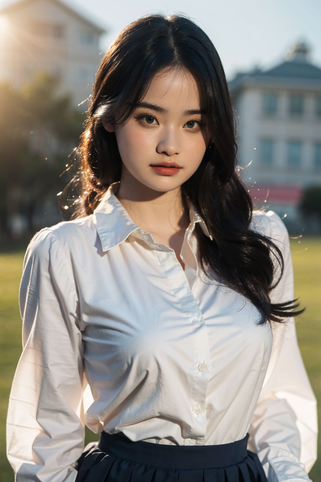 absurdres, high resolution, (high quality, masterpiece:1.2), cowboy shot, (lens flare, glitters), ((unbuttoned shirt)), realism, <lora:vanhvanh-15:1>, vanhvanh, youth, cute, ((breasts out)), junior highschool uniform