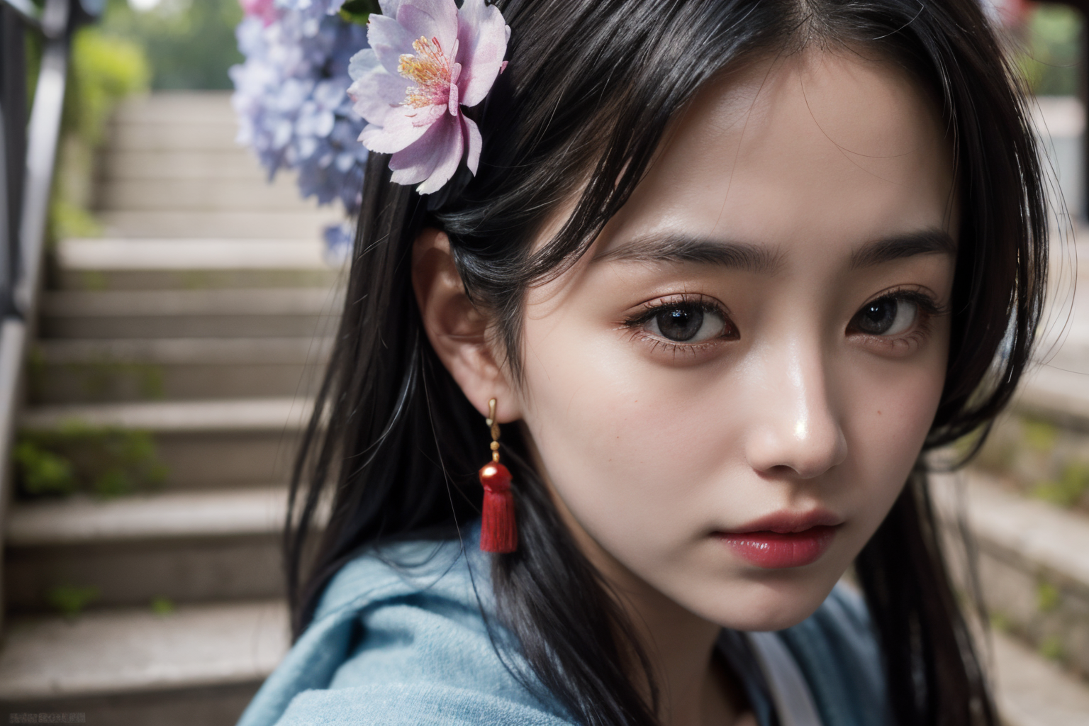 cinematic, best quality, masterpiece, hyper realistic, raw photo, (photorealistic:1.4), extremely delicate, ultra-detailed, extremely intricate, 1girl, perfect eyes, perfect lips, (detailed beautiful face, detail skin texture, ultra-detailed body:1.1), she is coming down long stairs of temple, (by stairs hydrangea flowers are blooming), japanese kimono and obi, in kyoto, small blue earring, outdoor, a bright red Japanese torii gate, soft lighting, bokeh, film grain, Fujifilm XT3, dynamic angle, <lora:add_detail:0.5>, <lora:FilmG2:0.6>