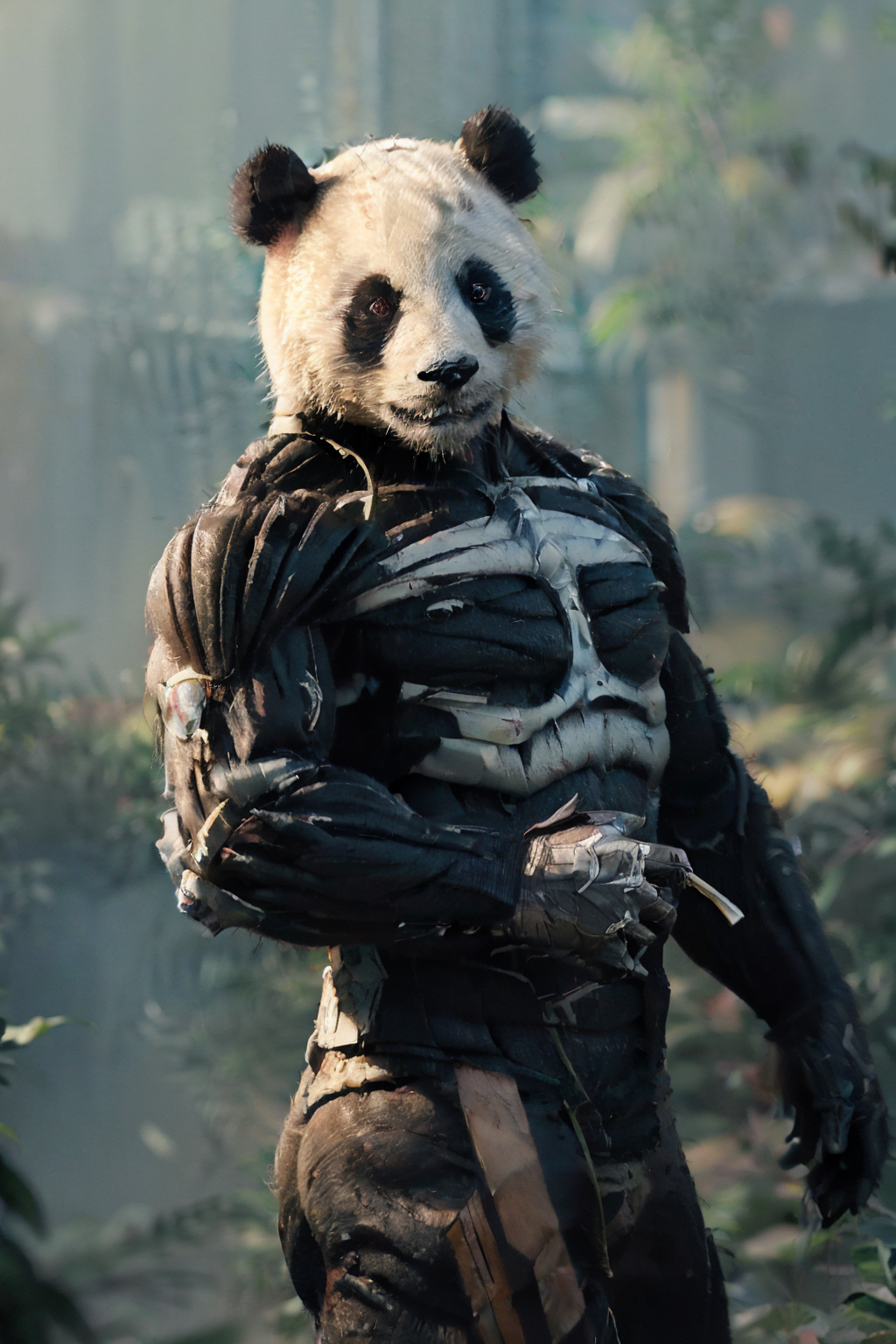 masterpiece, best quality, simple background, 1panda, cowboy shot, dynamic pose, <lora:panda_tm:1:FACE> panda, panda_tm, <lora:crNanosuit:1:CLOTHING> wearing crNanosuit,
