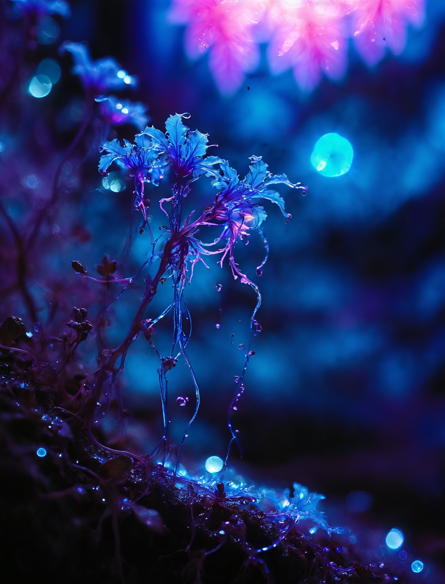 epiCPhoto, extraterrestrial bloom, bioluminescent blue tendrils, growing on a crystalline surface, shimmering with iridescent hues, detailed leaf space flora, translucent petals reflecting purple and pink lights, floating in an alien atmosphere, delicate root system, detailed cellular texture, sharp focus on pollen, radiant glow from a pulsar in the background