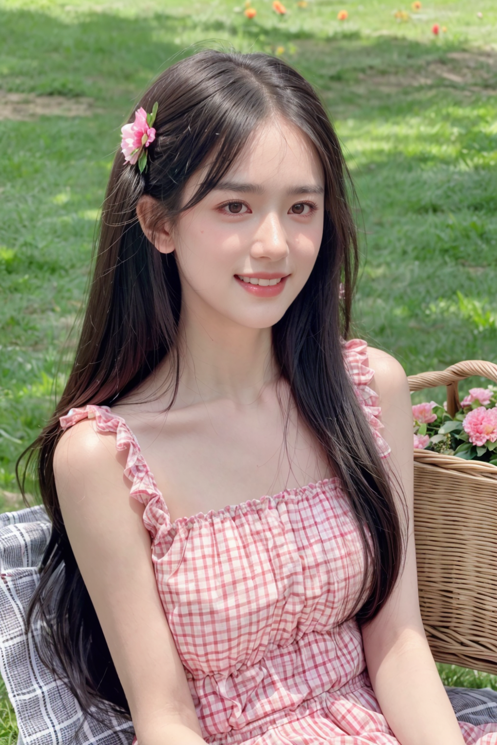1girl,long hair,air bangs,smile,flat belly,close up, At a quaint countryside picnic,in a gingham dress with a basket of flowers,sitting on a plaid blanket,surrounded by rolling hills,vintage pastoral charm, <lora:æ½æ_smile:1>,, (RAW photo, best quality),(realistic, photo-realistic:1.3),best quality,masterpiece,an extremely delicate,1