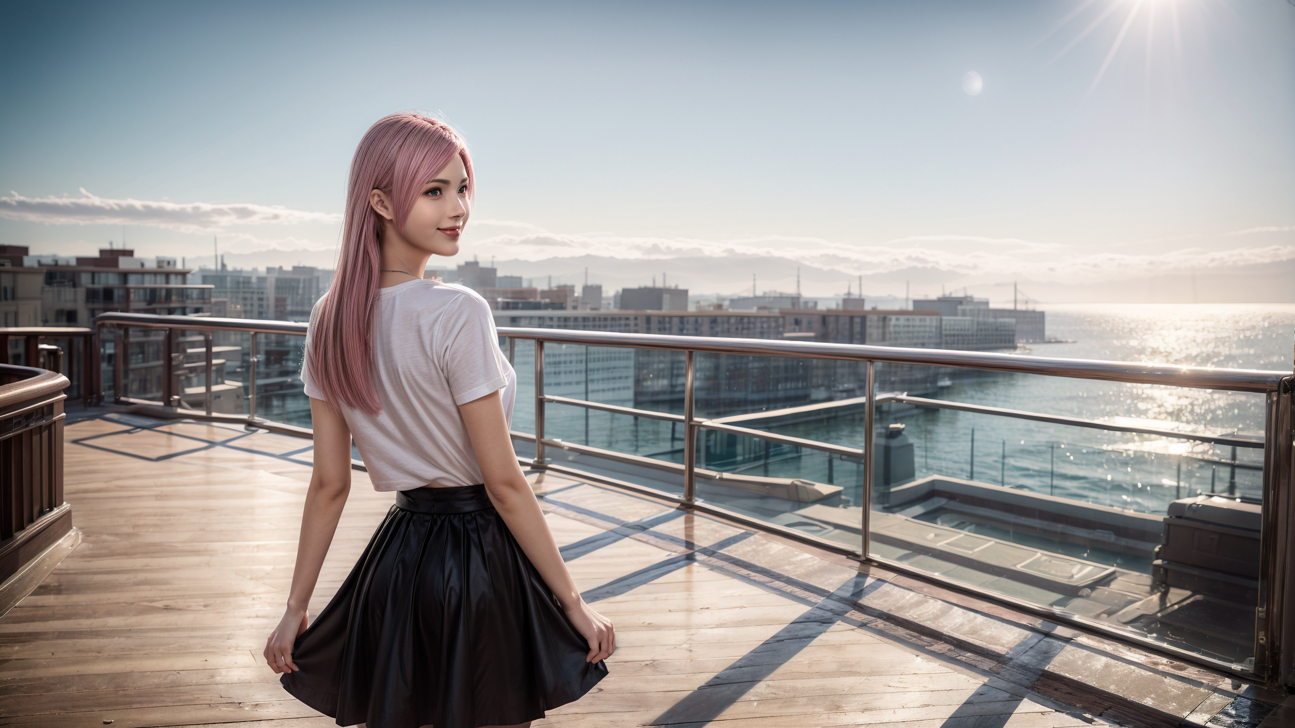 large DOF,from back,(8k, RAW photo, best quality, masterpiece:1.2),cinematic light,ultra-detailed,hyper detailed,absurdres,realistic,photo_(medium),<lora:add_detail:1>,<lora:depth_of_field_slider_v1:1.6>,(on the ship:1.1),happy,smile,t-shirt,knotting,high-waist_skirt,white long dress,yuukananri,pink hair,green eyes,long hair,cloud,ship deck,tetsukui,sunlight,daytime,ocean,<lora:yuukananri-base-01:0.7>,
