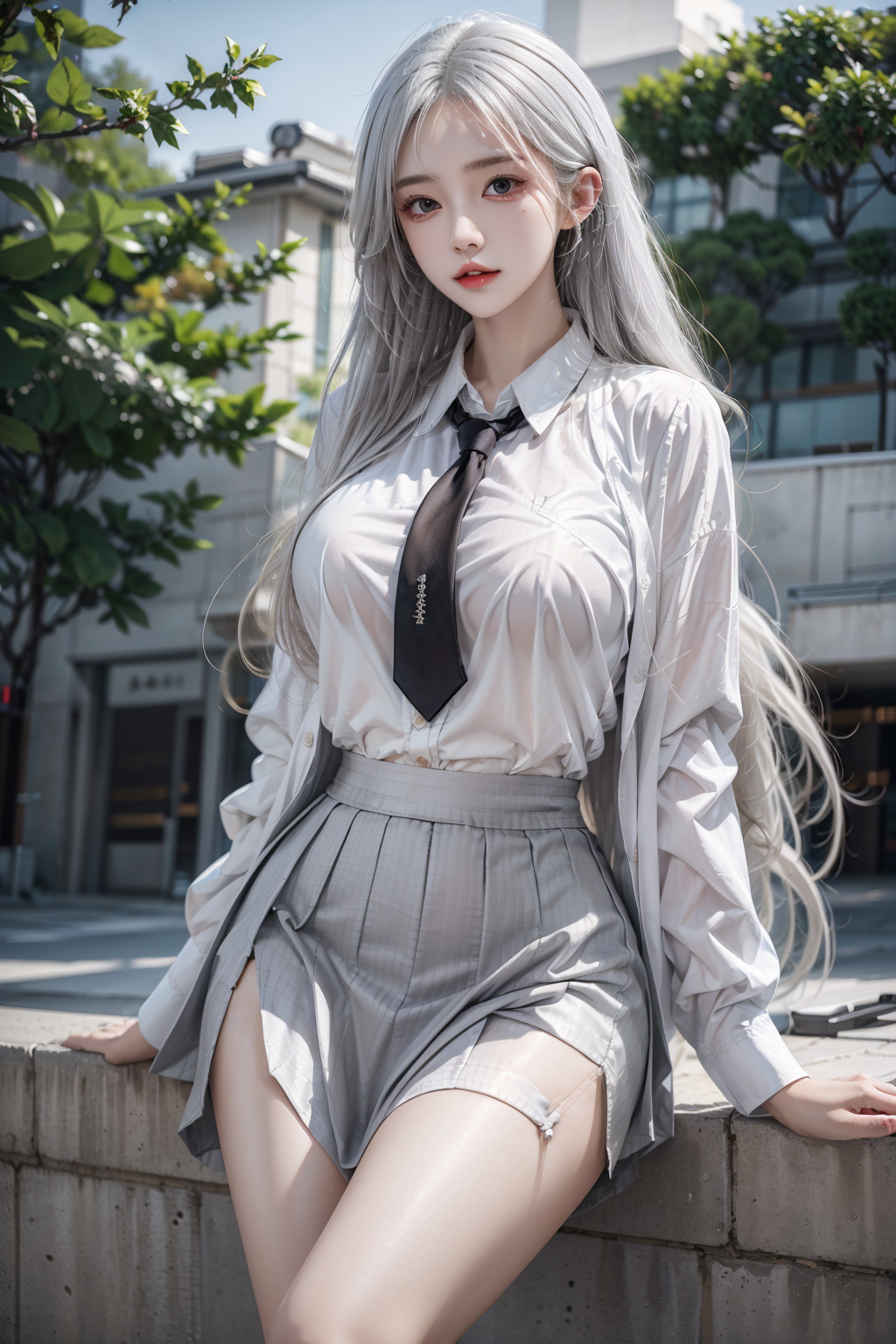 masterpiece,best quality,1girl,solo,upper body,hips up,long white hair,school uniform,shirt,grey skirt,huge breasts,outdoor,<lora:more_details:0.3>,<lora:FN:0.6>,