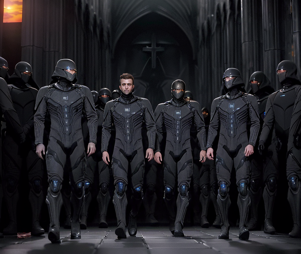 (((full body))),(((5 males, handsome)))+++, (((wearing gray and black nano-suits)))+++, (((in bloody sunsets))), (((inside giger cathedral)))+++, super high resolutions, best quality, masterpiece, depth of field, realistic, photo-realistic, cinematic, (battlefield behind:1.38), (dark and foggy environment:0.6), (spaceship outdoors background:0.6), (heavy fog environment:0.6),