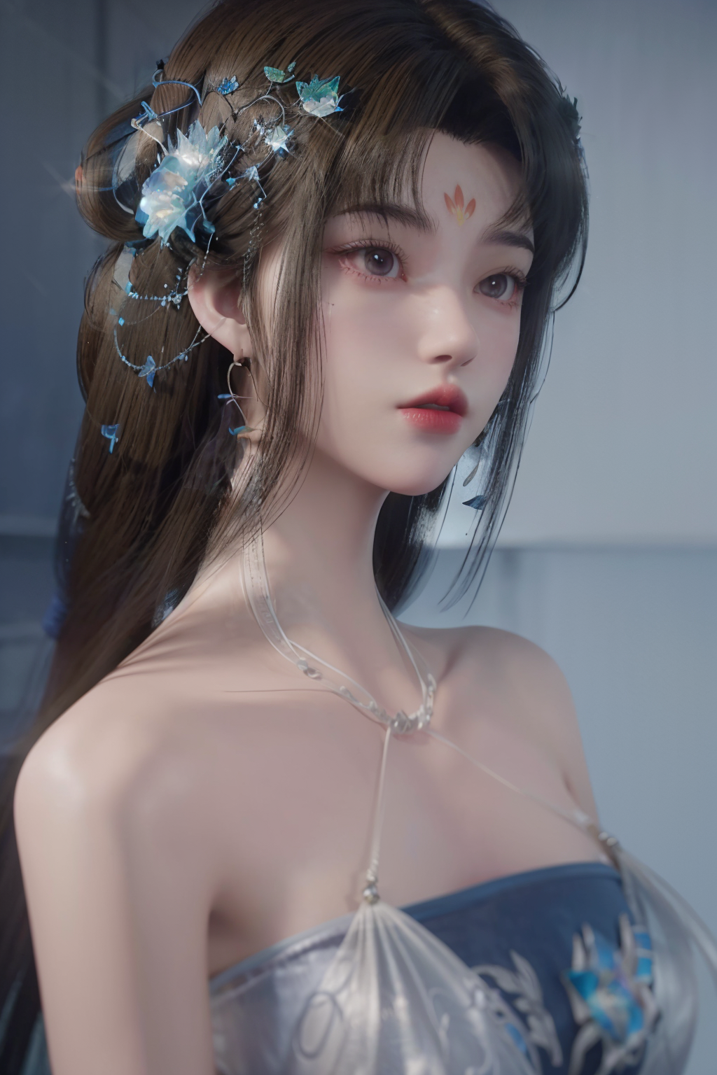 breathtaking <lora:ChengLing:1>,halter top,sexy,1girl,jewelry,forehead mark,solo,long hair,hair ornament,camisole,transparent,embroidered camisole,glowing,alpha transparency,see-through,sparkle,facial mark,earrings,upper body,white background,necklace,brown hair,pearl,flower,cleavage,<lora:Detail Tweaker LoRA (ç»èè°æ´):0.4>,, best quality , masterpiece, illustration, an extremely delicate and beautiful, extremely detailed ,CG,unity,8k wallpaper, Amazing, finely detail, masterpiece, best quality,official art,extremely detailed CG unity 8k wallpaper,absurdres, incredibly absurdres, huge filesize , ultra-detailed, highres, extremely detailed,beautiful detailed girl, extremely detailed eyes and face, beautiful detailed eyes,light on face, . award-winning, professional, highly detailed