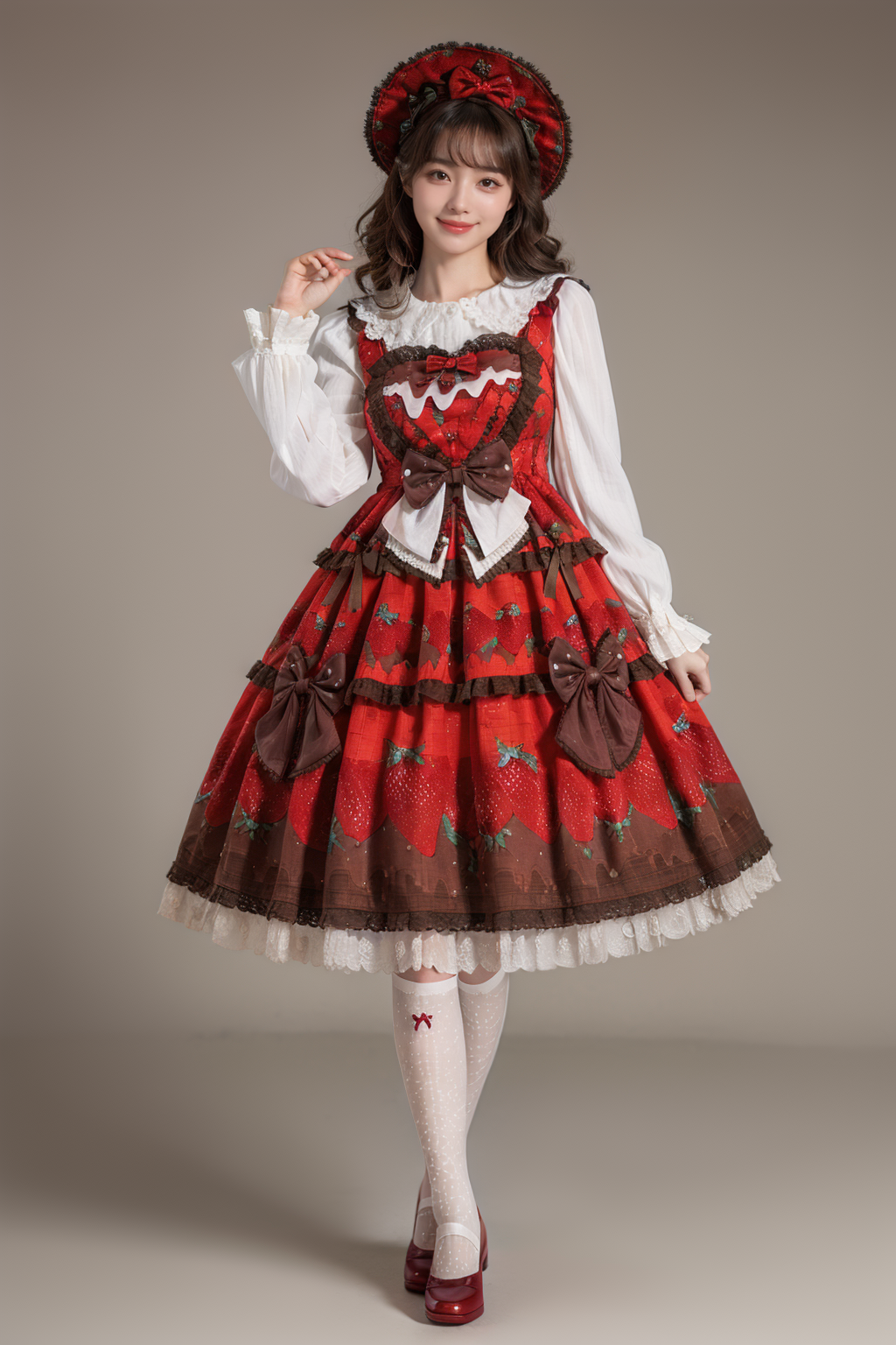 best quality,masterpiece,realistic,photorealistic,1girl,solo,looking at viewer,smile,standing,full body,arm up,cyb dress,layered dress,print dress,frilled dress,strawberry print,dress bow,bow,white shirt,long sleeves,hair bow,hat,kneehighs,red shoes,grey simple background,<lora:lo_dress_vol3_style3_v1:0.6>,