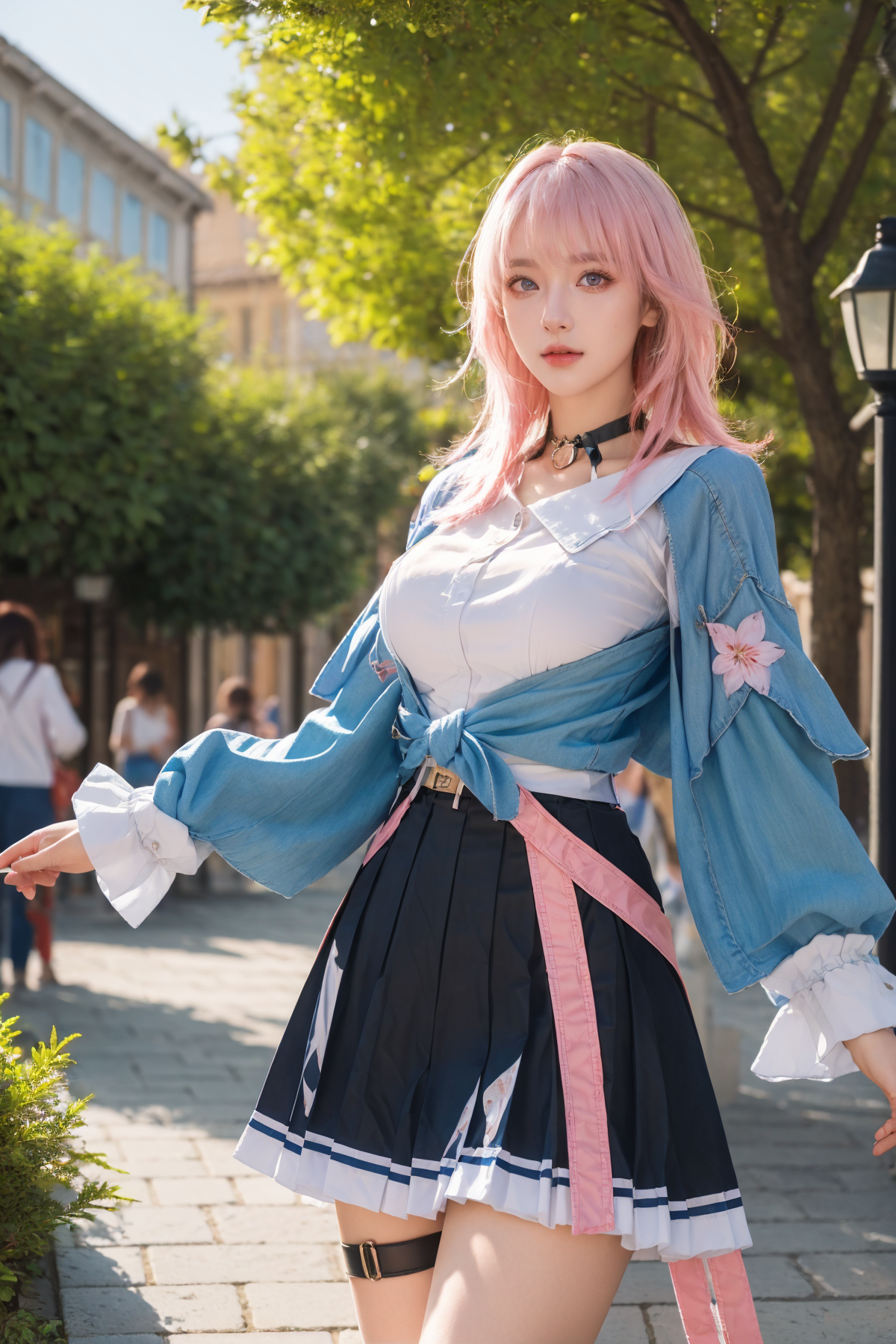 (Best Quality, Masterpiece:1.4), (Realism:1.2), (Realisitc:1.2), (Absurdres:1.2), (photorealistic:1.3), Realistic Skin,Solo,( Very Big Eyes,beautiful detailed eyes, symmetric eyes,), ((cowboy shot)),1girl,solo, <lora:March_7th_V2.0:0.85>, March_7th(Honkai_StarRail),1girl, smile, neck ribbon, pink hair, medium hair, blue jacket, white shirt, huge breasts, thighs, thigh strap, skirt, boots, full body, standing,(cowboy shot),(masterpiece, high quality, best quality), (colorful),(delicate eyes and face), volumatic light, ray tracing, extremely detailed CG unity 8k wallpaper,solo, ((flying petal)),(from below), outdoors, Cobblestone Streets, Quaint Architecture, Charming Cafs, Flower-Adorned Windows, Cozy Boutiques, Lush Greenery, Vibrant Market Stalls, Riverside Scenes, Vintage Lampposts, Old-world Elegance