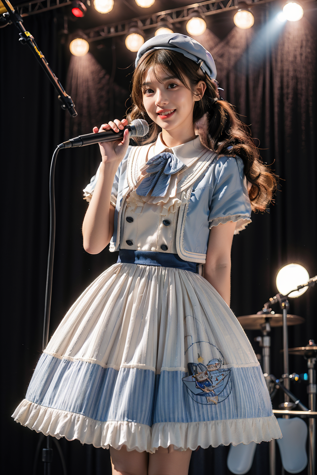 best quality,masterpiece,realistic,photorealistic,1girl,solo,looking at viewer,smile,standing,twintails,black hair,long hair,cowboy shot,dynamic pose,idol clothes,dress,collared dress,jacket,cropped jacket,short sleeves,bowtie,bow,buttons,hat,beret,holding microphone,singing,idol,stage,stage in the backgorund,stage lighting,stage spotlight,detailed background,audience,people,<lora:idol_costume_style10_v1:0.7>,<lora:Background_Detail_v3:1.5>,