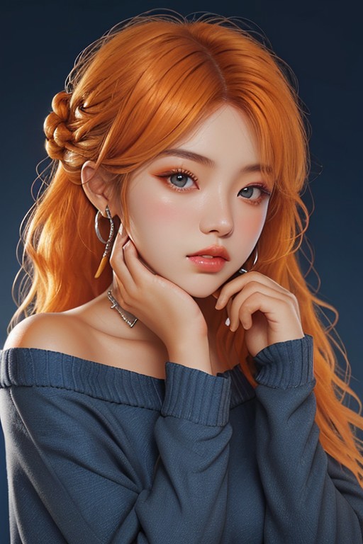 extreme close up photo, front view of beautiful 20 years old Korean woman, hands braiding her long blonde hair in front, biting black silk ribbon in lips, beautiful kpop idol, blonde hair, wearing loose off shoulder orange worn out sweater, shiny silver bangles on wrist, aegyo sal, no makeup, posing in dark blue studio background, ringlight studio flash front lighting with blue shadows underglow fill light, orange overhead hair light, orange rimlight, dramatic studio lighting