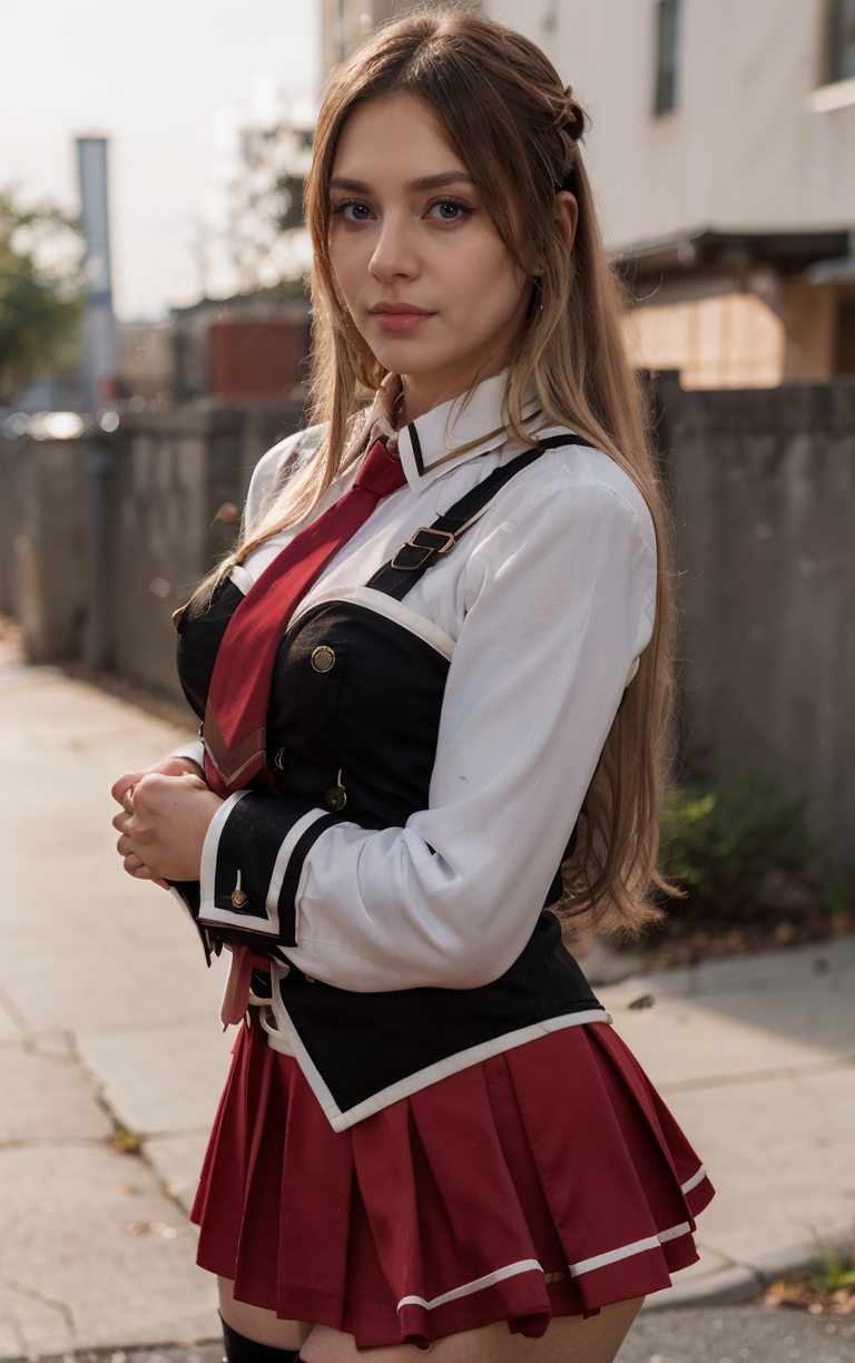 ((masterpiece, best quality)), insaneres, absurdres, solo, outdoors, CLOTHING_BibleBlack_SchoolDress_ownwaifu, 1girl, blonde hair, long hair, blue eyes, black vest, red skirt, white shirt, collared shirt, suspenders, school uniform, black thighhighs, zettai ryouiki, necktie, long sleeves, pleated skirt, red necktie, (portrait, close-up)<lora:CLOTHING_BibleBlack_SchoolDress_ownwaifu:0.8>, lens flare, depth of field, bokeh, embers, vanishing point, looking at viewer,