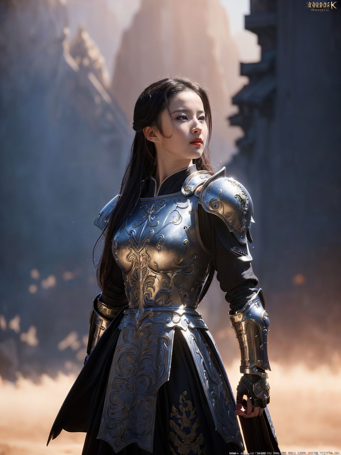 liuyifei,high res, masterpiece, unity 8k wallpaper,female knight, heaven armor,armor is flamboyant and exaggerated, light and shadows, light reflections, unreal engine, illustration, steampunk, concept art 10K iAnge Inc, artistic redshift render, physically based rendering, tilt shift, action cinematic, video game cover art <lora:liuyifei_dragon_mj7_8:0.5><lora:epi_noiseoffset2 (1):0.6> <lora:more_details (1):0.6>