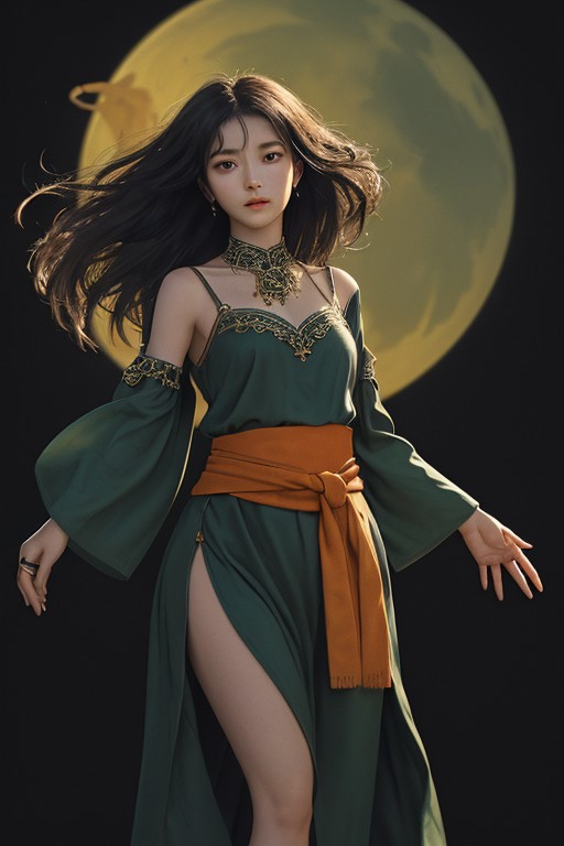 score_9, score_8_up, score_7_up, Silhouette Art, breathtaking ( absurdres divine aesthetic extravagant ink sketch), amazing fine detailed masterpiece, lovely, charming, awe-inspiring, radiant, magnificent, (all dark hues and fine vibrant orange glowing smoldering accent),score_9, score_8_up, score_7_up, dynamic view, pretty face, her clothes are simple but elegant and her exquisite small face was devoid of any cosmetics, displaying an image of natural beauty and innocence, she has long sleek black hair, she has a short green cloth gathered at her waist, When the wind blows over her hair it stirred one’s heart, On the young lady’s small waist a pale purple belt thoroughly outlined her graceful curves in a manner that even the eyes of a passer-by could not help but see,