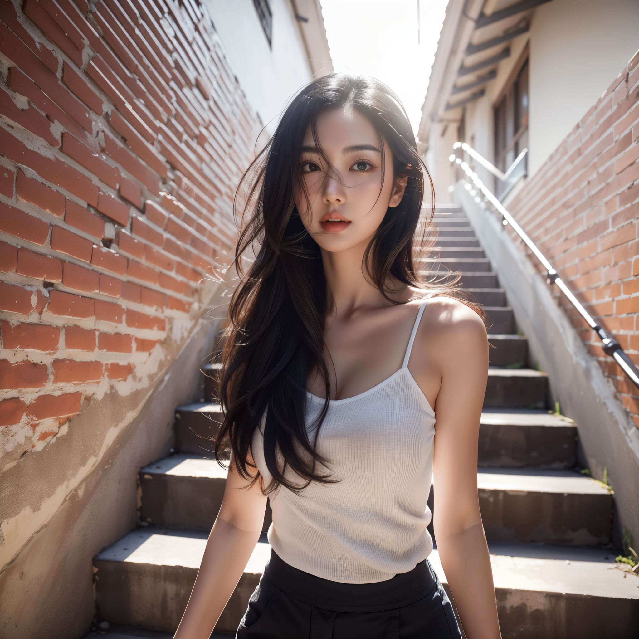masterpiece, photorealistic, 9k uhd, bestres, ultra detailed brick wall, stairs, black hair taiwan girl, lady, picture, photorealistic, dynamic pose, bright foreground