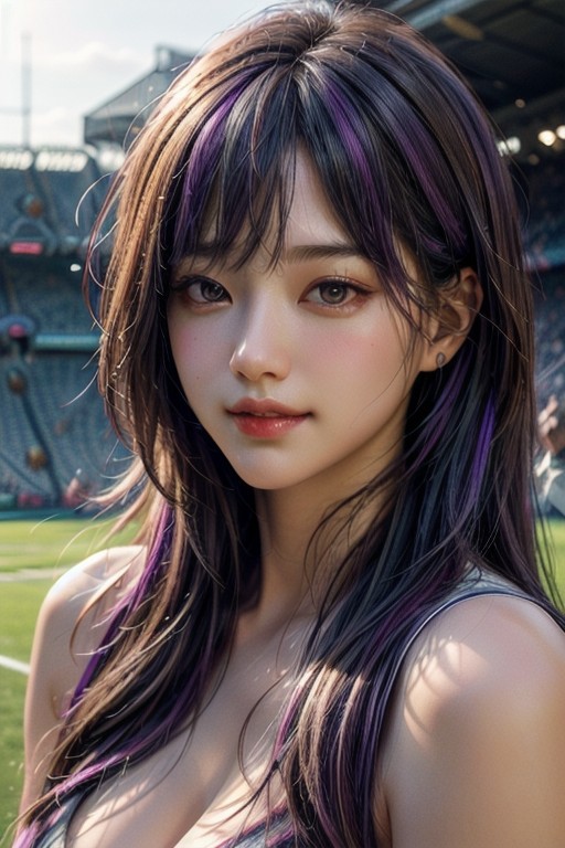 (RAW photo, best quality), (masterpiece:1.2), (realistic, photo-realistic:1.3), best quality, highres, extremely detailed CG, perfect lighting, 8k wallpaper, Amazing, finely detail, ultra-detailed, a girl, streaked hair, violet hair, slightly smiling, stadium background,