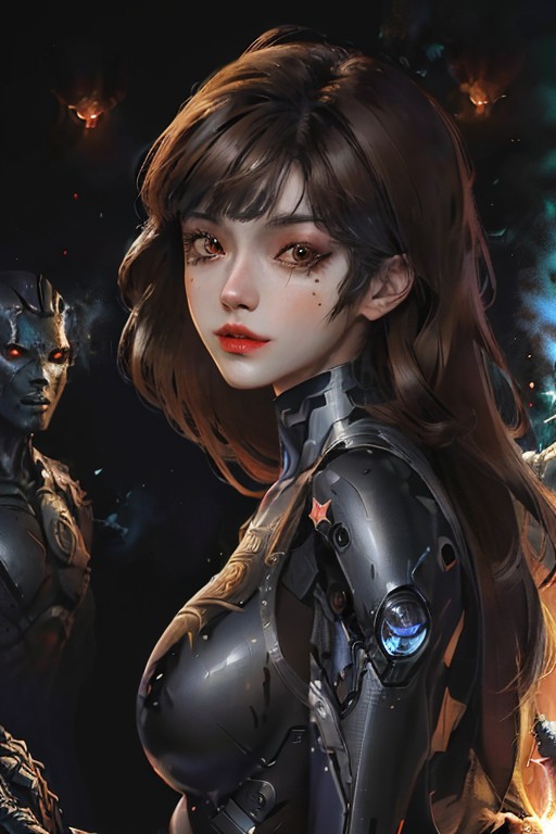 looking at viewer,detailed background,Cinematic Lighting,film grain,score_9,score_8_up,score_7_up,masterpiece,best quality,highly detailed, <lora:(增强)sdxl_lightning_8step_lora:1>,<lora:glowneon_xl_v1:1>,glowing,<lora:add_details_xl:1>,<lora:hand 4:0.8>,hand person,Expressiveh,,colorful, 1girl, Tomie Kawakami, another face.,,long hair,spine,breasts,brown hair,huge breasts,mechanical parts,science fiction,android,cyborg,brown eyes,bodysuit,black hair,gradient,lips,joints,robot joints,closed mouth,skin tight,dark skin,dark-skinned female,bangs,mechanical arms,robot,looking at viewer,spaceship, mobilsuit cockpit,<lora:proneXLP:0.4>,,on stomach,lying,from side,