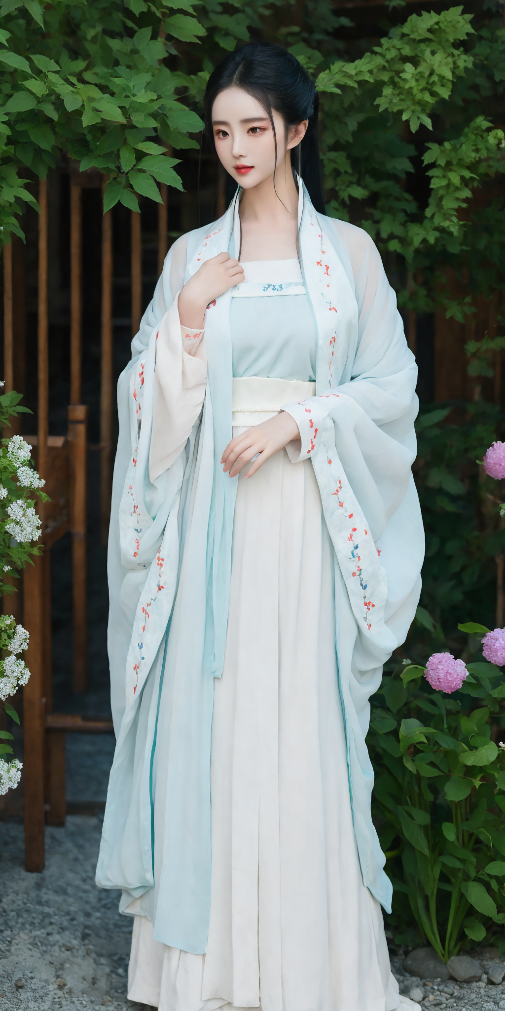 1girl,solo,perfect face,look at viewer,standing, hanfu,white dress,long sleeves, plant,flower, masterpiece,best quality,highly detailed,