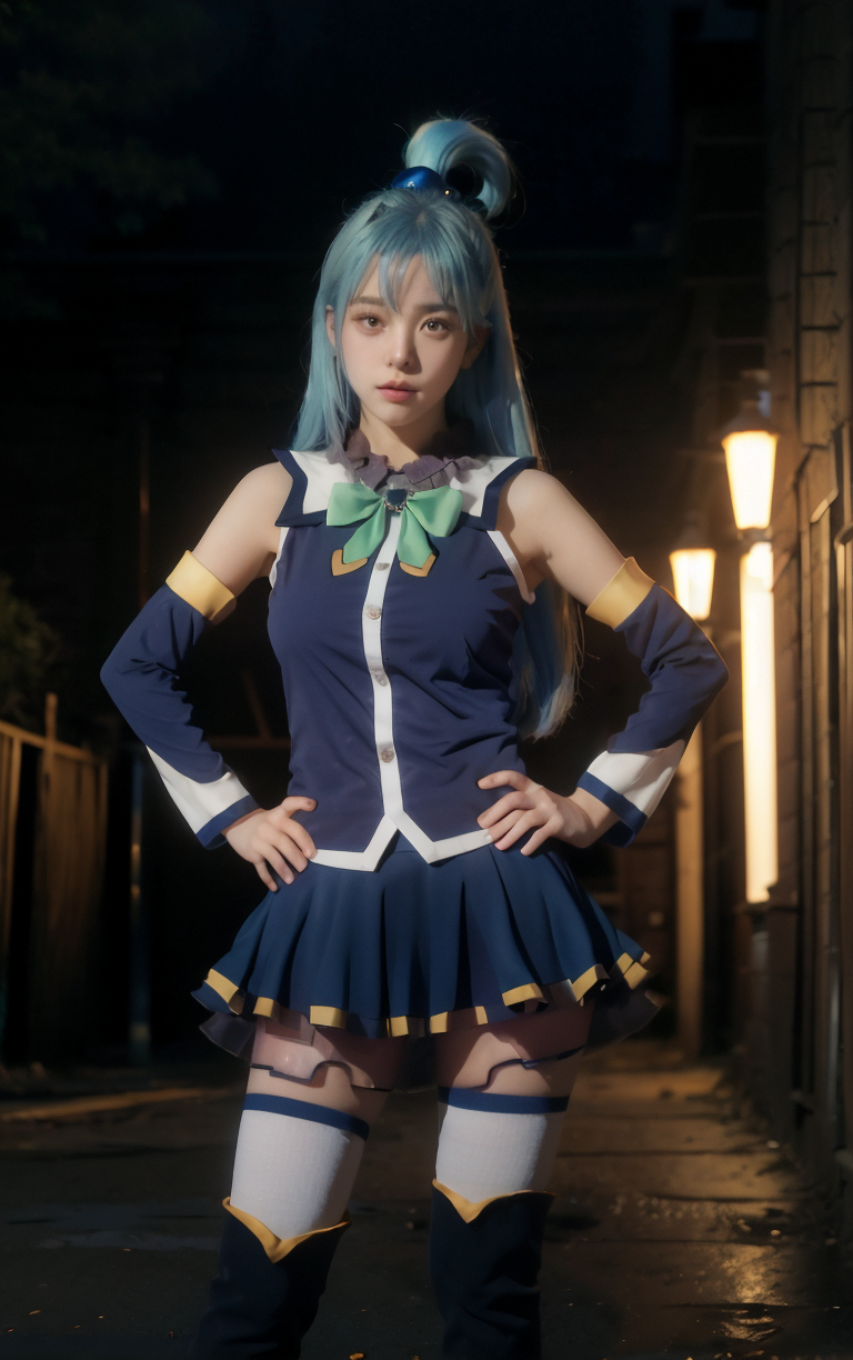(masterpiece, best quality:1.4), insaneres, absurdres, solo, looking at viewer,BREAK BlueDress_Aqua_ownwaifu, 1girl, aqua (konosuba), hair rings, hair ornament, blue hair, long hair, blue eyes, single hair ring, bangs, large breasts, hair between eyes, ponytail, shiny hair, detached sleeves, bare shoulders, blue skirt, green bow, blue shirt, blue thighhighs, white thighhighs, miniskirt, green bowtie, thighhighs under boots, white sleeves, long sleeves, sleeveless shirt, (contrapposto, hand on hip), sunset, sidelighting, cityscape, vanishing point, outdoors, <lora:ANIME_KonoSuba_Aqua_ownwaifu:1> , depth of field, solo,