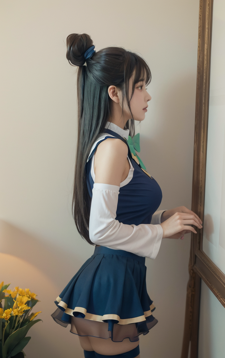 (masterpiece, best quality:1.4), insaneres, absurdres, solo, looking at viewer,BREAK BlueDress_Aqua_ownwaifu, 1girl, aqua (konosuba), hair rings, hair ornament, blue hair, long hair, blue eyes, single hair ring, bangs, large breasts, hair between eyes, ponytail, shiny hair, detached sleeves, bare shoulders, blue skirt, green bow, blue shirt, blue thighhighs, white thighhighs, miniskirt, green bowtie, thighhighs under boots, white sleeves, long sleeves, sleeveless shirt, (profile, portrait, picture frame), falling petals, red petals, wall, <lora:ANIME_KonoSuba_Aqua_ownwaifu:0.85>, solo,