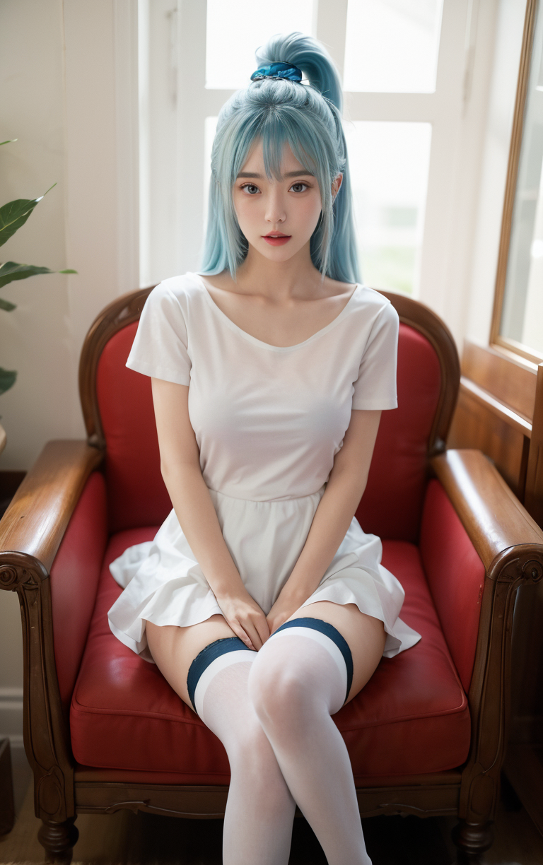 (masterpiece, best quality:1.4), insaneres, absurdres, solo, looking at viewer,BREAK WhiteShirt_Aqua_ownwaifu, 1girl, aqua (konosuba), blue hair, bangs, blue eyes, hair ornament, hair rings, large breasts, clothes writing, collarbone, white shirt, white thighhighs, legs, short dress, short sleeves, thigh gap, white dress, zettai ryouiki, (sitting on throne, sitting, throne), throne room, straight-on, curtains, light particles, bokeh, loaded interior, indoors, <lora:ANIME_KonoSuba_Aqua_ownwaifu:0.75>, solo,