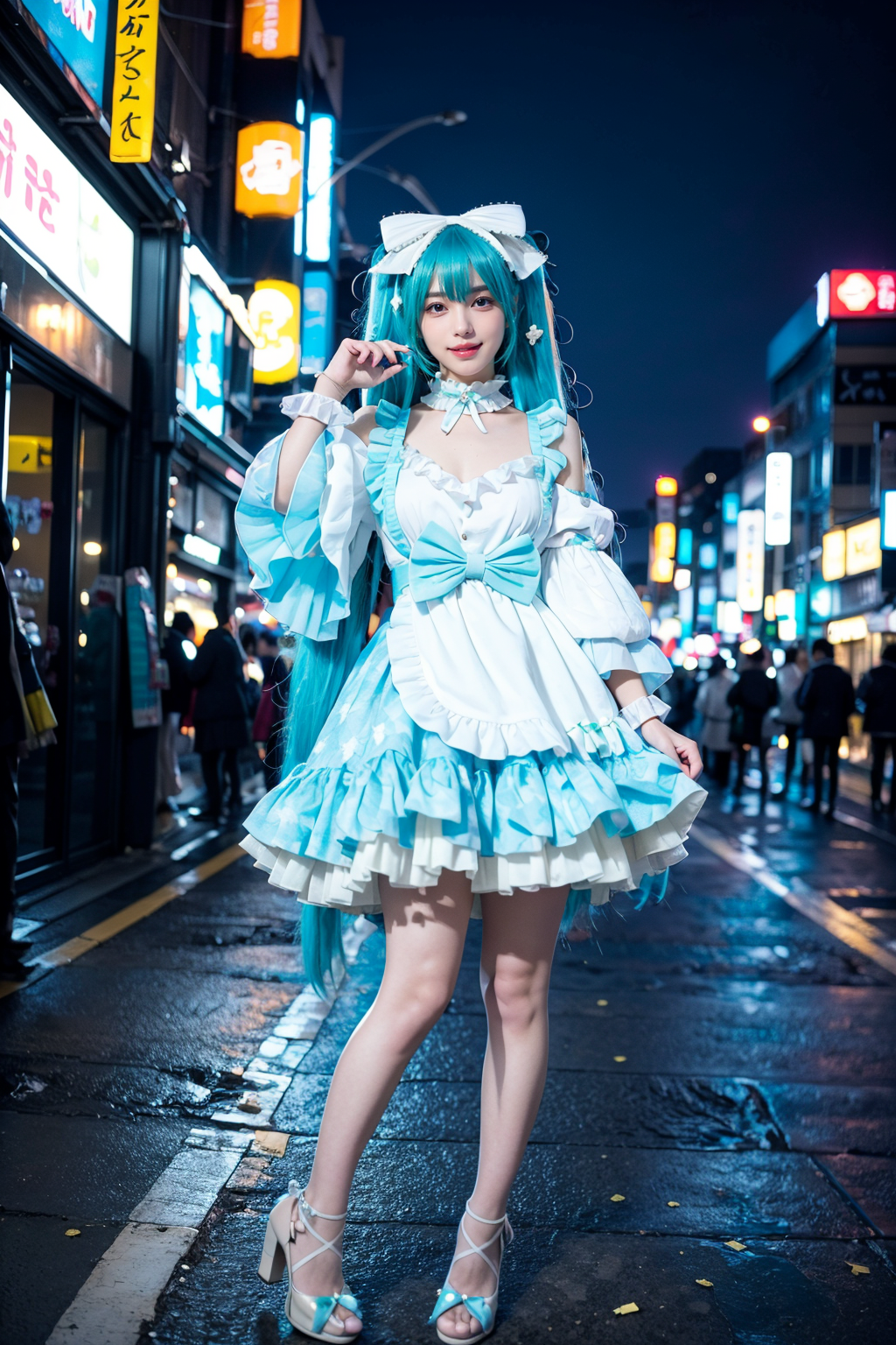 realistic,photorealistic,best quality,masterpiece,highres,8k,RAW photo,ultra-detailed,full body,1girl,solo,smile,looking at viewer,standing,miku cosplay costume,hatsune miku,cosplay,aqua hair,very long hair,twintails,dress,frilled dress,frills,long sleeves,wide sleeves,choker,bow,hair bow,ribbon,wrist cuffs,high heels,street,night,people,neon lights,shop,tokyo,detailed background,<lora:miku_cosplay_16thAnnDress_v1:0.7>,<lora:Background_Detail_v3:1>,<lora:background & distence control:-1>,