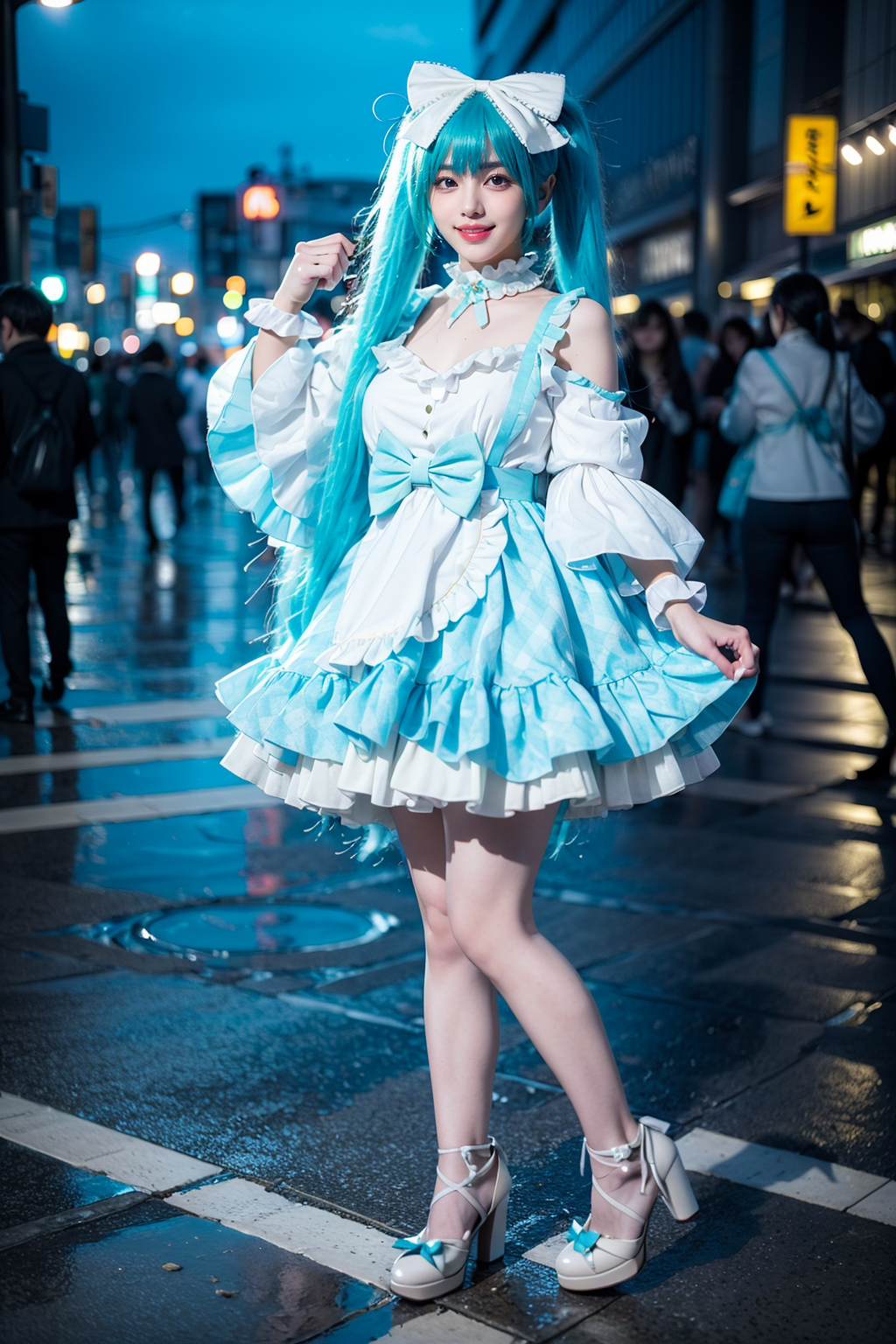 realistic,photorealistic,best quality,masterpiece,highres,8k,RAW photo,ultra-detailed,full body,1girl,solo,smile,looking at viewer,standing,miku cosplay costume,hatsune miku,cosplay,aqua hair,very long hair,twintails,dress,frilled dress,frills,long sleeves,wide sleeves,choker,bow,hair bow,ribbon,wrist cuffs,high heels,street,night,people,neon lights,shop,tokyo,detailed background,<lora:miku_cosplay_16thAnnDress_v1:0.7>,<lora:Background_Detail_v3:1>,<lora:background & distence control:-1>,