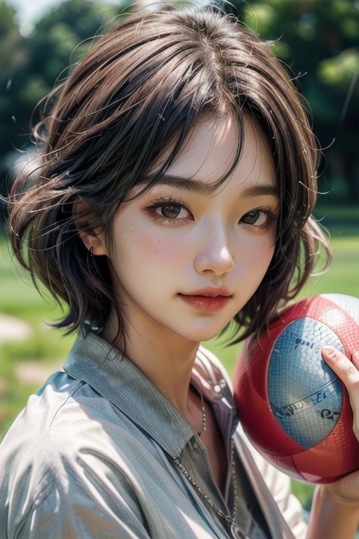 (RAW photo, best quality), (masterpiece:1.2), (realistic, photo-realistic:1.3), best quality, highres, 8k wallpaper, Amazing, finely detail, ultra-detailed, a pretty girl resembling a K-pop star, beauty and healthy, One Piece comics's Boa Hancock hairstyle and face, nicely blurred eyebrows, grey eyes, quite thin open shirt, glamorous, long string necklace, at the rainy field, slightly tired but slightly smile, on hot summer day, sweat, holding a transparent ball one's side,