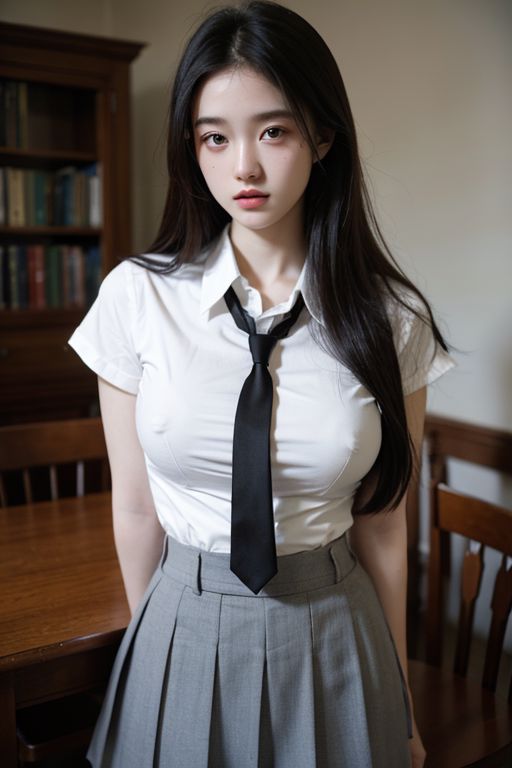 photo of a beautiful sweet young woman 18 yo, big breast, pale skin, imperfect skin, moody atmosphere, grainy, (school uniform), shirt ,(masterpiece:1.2), (best quality:1.2), (extremely detailed), realistic skin texture, intricate detailed, 32k resolution