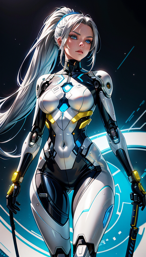Highly detailed digital illustration featuring a female character with a futuristic and cybernetic aesthetic. The subject has long,silver hair styled in a high ponytail,with striking blue eyes and fair skin. She is wearing a blue,form-fitting outfit adorned with intricate gold floral patterns. Her right arm is a metallic,robotic prosthetic,showcasing advanced technology. The background is a solid,vibrant yellow,which contrasts sharply with the character's cool-toned appearance. The overall style is a blend of realism and anime,with a focus on high detail and vibrant colors, <lora:a2:1>,<lora:add_detail:1>,