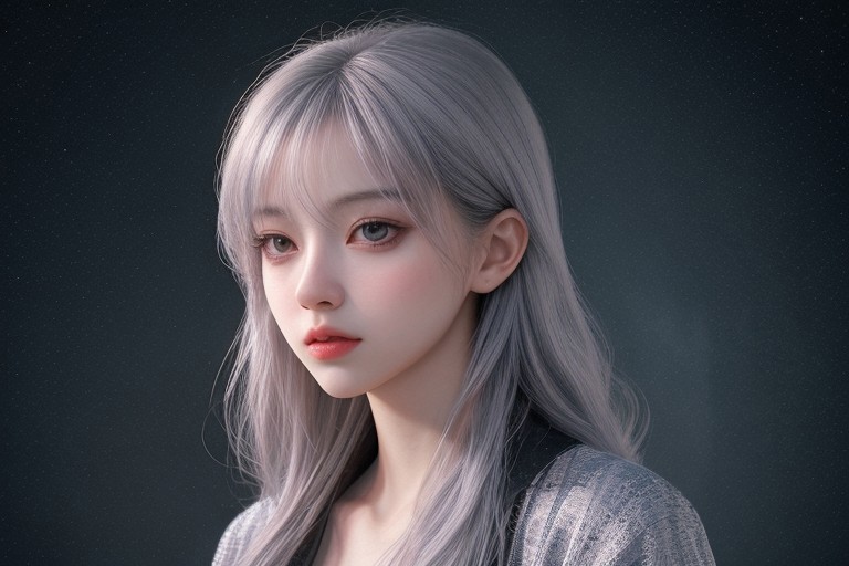realistic, silver hair,Wide shot of the sing k-pop girl under starlight, Double Exposure, realistic description of the skin