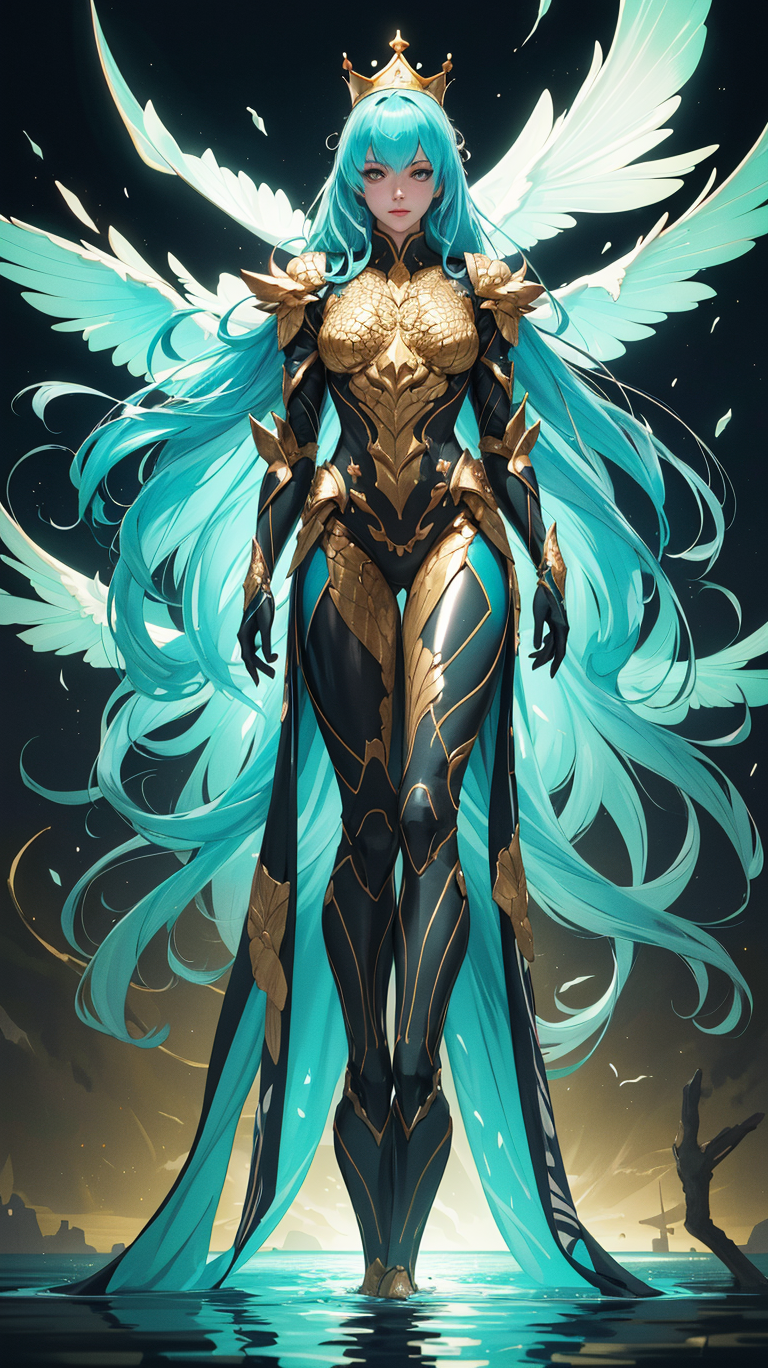 best quality,master,masterpiece,award-winning works,1 female,solo,scaly chitin scale skin on torso,long Neon cyan hair,colorful,glow,surreal,fantasy,mystery,crown,dynamic posture,(whole body scale:1.4),<lora:extremely_detailed:0.8>,mysterious pattern,standing in the lake,