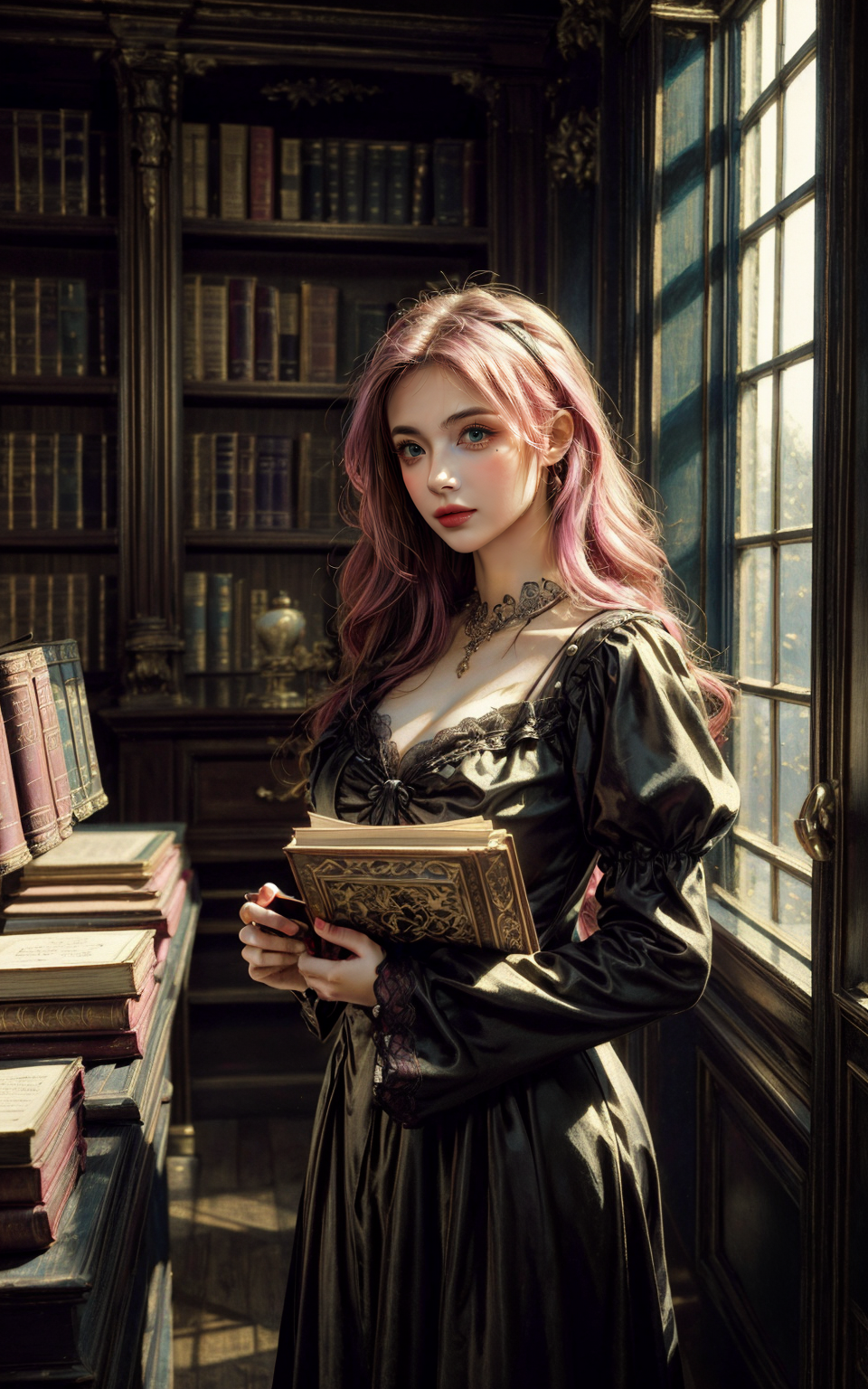 gothic and romanticism style,1girl\(yuukananri,pink hair,green eyes,long hair\),dimly lit library with tall arched windows,ancient bookshelves filled with old books,heavy curtains partially blocking the natural light,deep red,dark purple,golden and brown tones,mysterious and romantic atmosphere,noblewoman wearing a dark Victorian gown with intricate gothic embroidery,holding an ancient scroll,gentle breeze causing the gown and scroll to softly flutter,subtle shadows,detailed setting,slightly dreamlike feel,historical elements,aristocratic elegance,high contrast lighting,(masterpiece:2),(best quality:1.1),ultra highres,original,extremely detailed,perfect lighting,Cinematic Lighting,<lora:add_detail:1>,