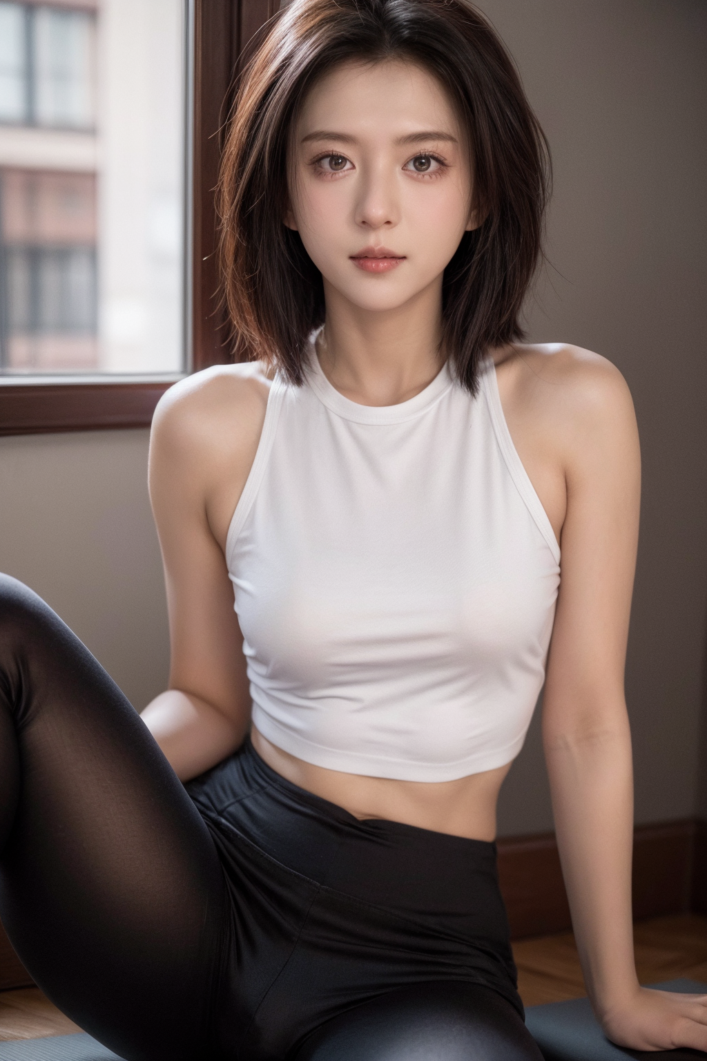 1girl, high quality, looking at viewer, , upper body, center opening, yoga pants,(photorealistic, realistic),sitting, crotch seam, <lora:hsyu_v1:0.45> <lora:add_detail:1> <lora:ip-adapter:0.65>