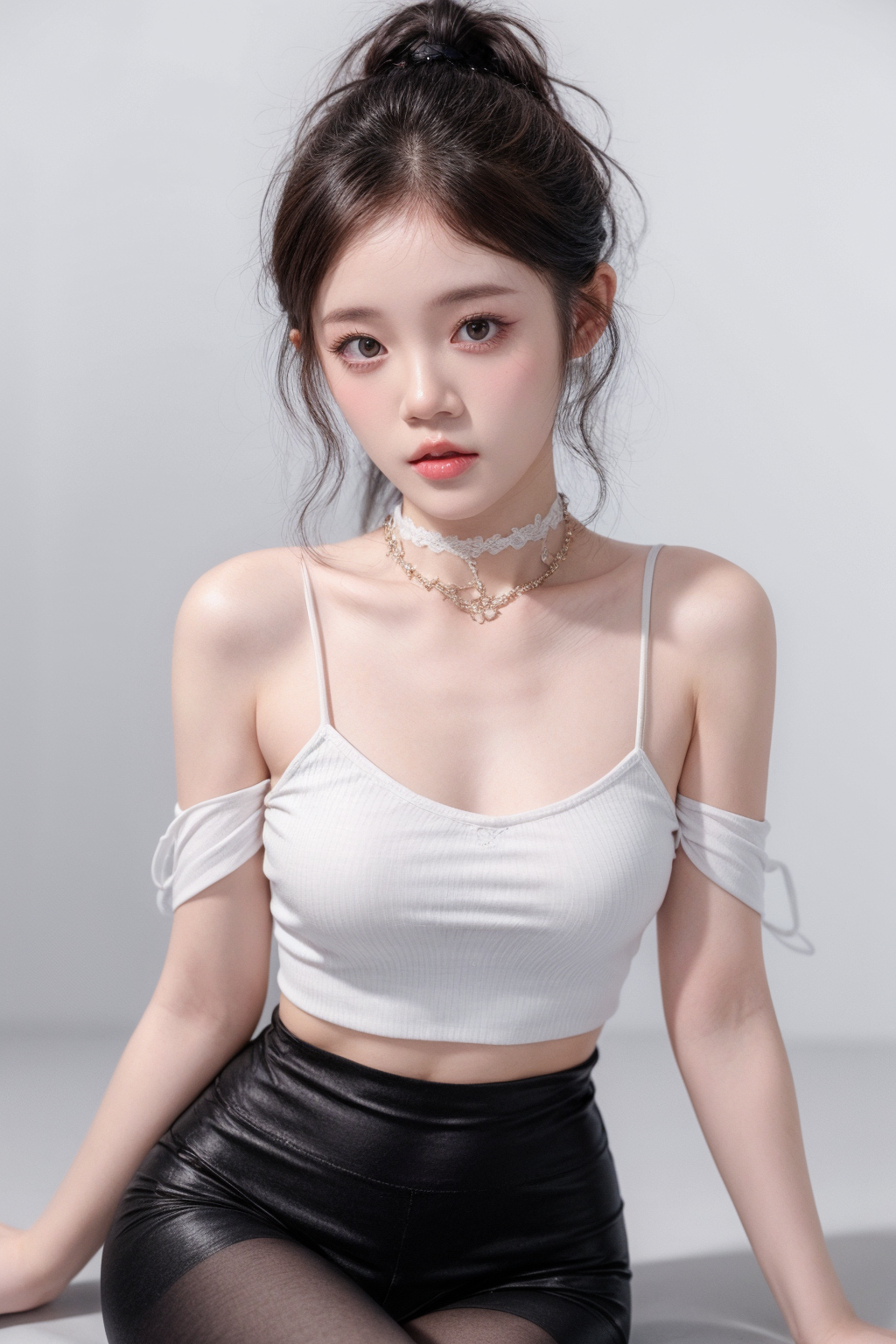 1girl, high1girl, high quality, looking at viewer, tight,, camisole, off shoulder, , cowboy shot, thigh gap, sitting, knees up, , choker, , simple background, yoga pants, facing viewer, <lora:add_detail:1> <lora:ip-adapter:0.65> <lora:zhongyuxin_v1:0.43>