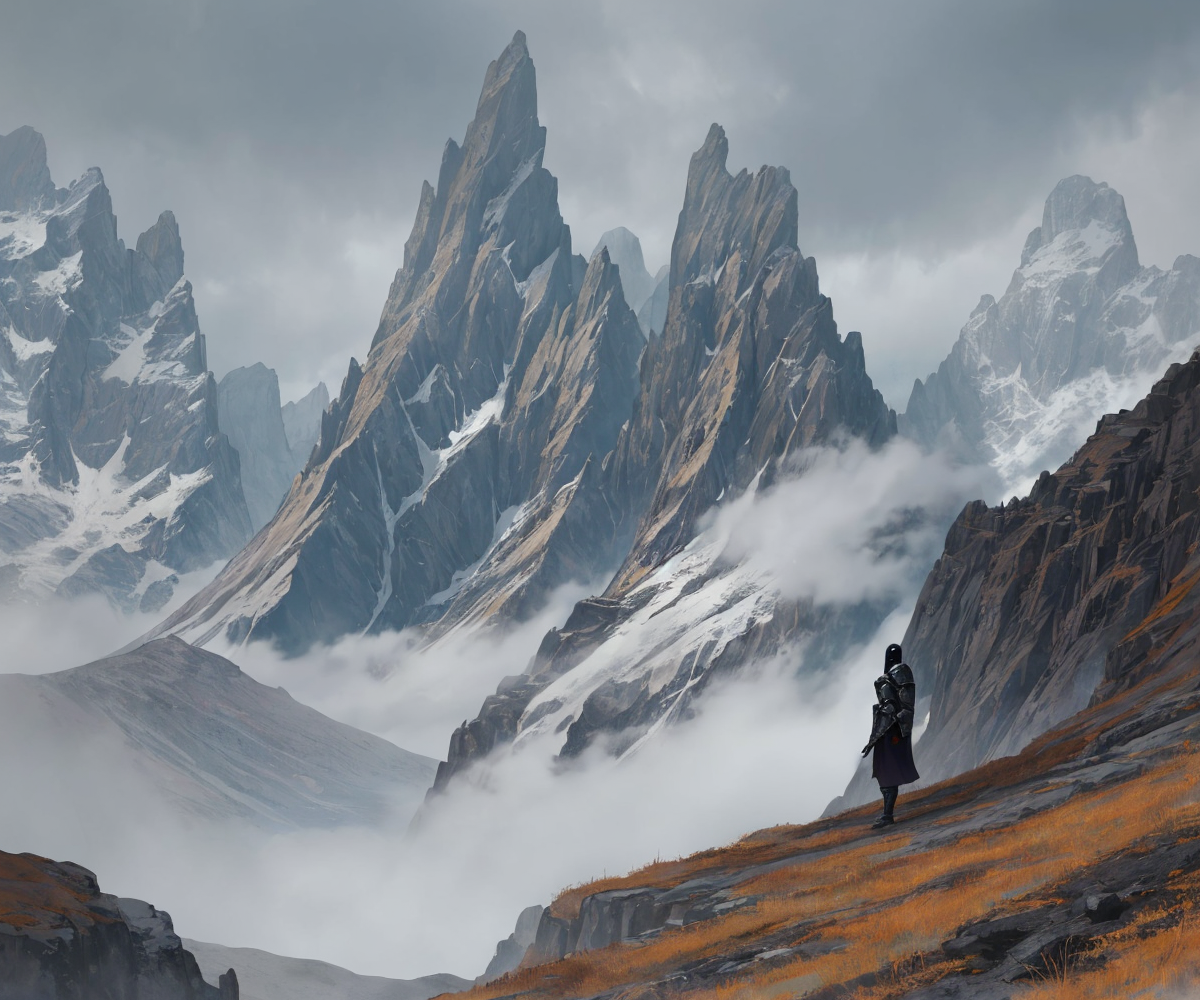 score_9, score_8_up, score_7_up, score_6_up, BREAK, ominous, gloomy, misty, far away, distance shot of a mountain, a cave opening is in the side of a mountain, (solo), in the far background is one man in light armor, the man is very small scale compared to the environment, medieval, dark fantasy, masterpiece, <lora:add-detail-xl:1>, PYS-XL,