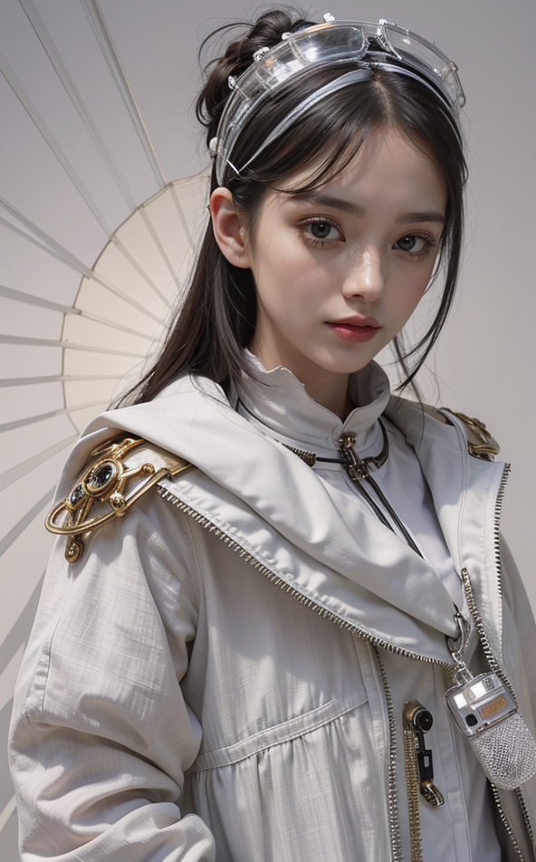 toosh, jacket, eye_reflections, gold fabric, clear plastic, light, full body, straps, electrical, translucent, transparent, future, gizmo, keys, handheld, plant, LCD screen, computer, gpu, waveform, wires, buttons, switches, dials, walkie talkie, radar, IR, pinterest, ferrofluid, steampunk, cyber, cyberpunk, perspective, macro, intricate details, beautiful lighting, best quality, masterpiece, ultra highres, photorealistic (white background:1.8)