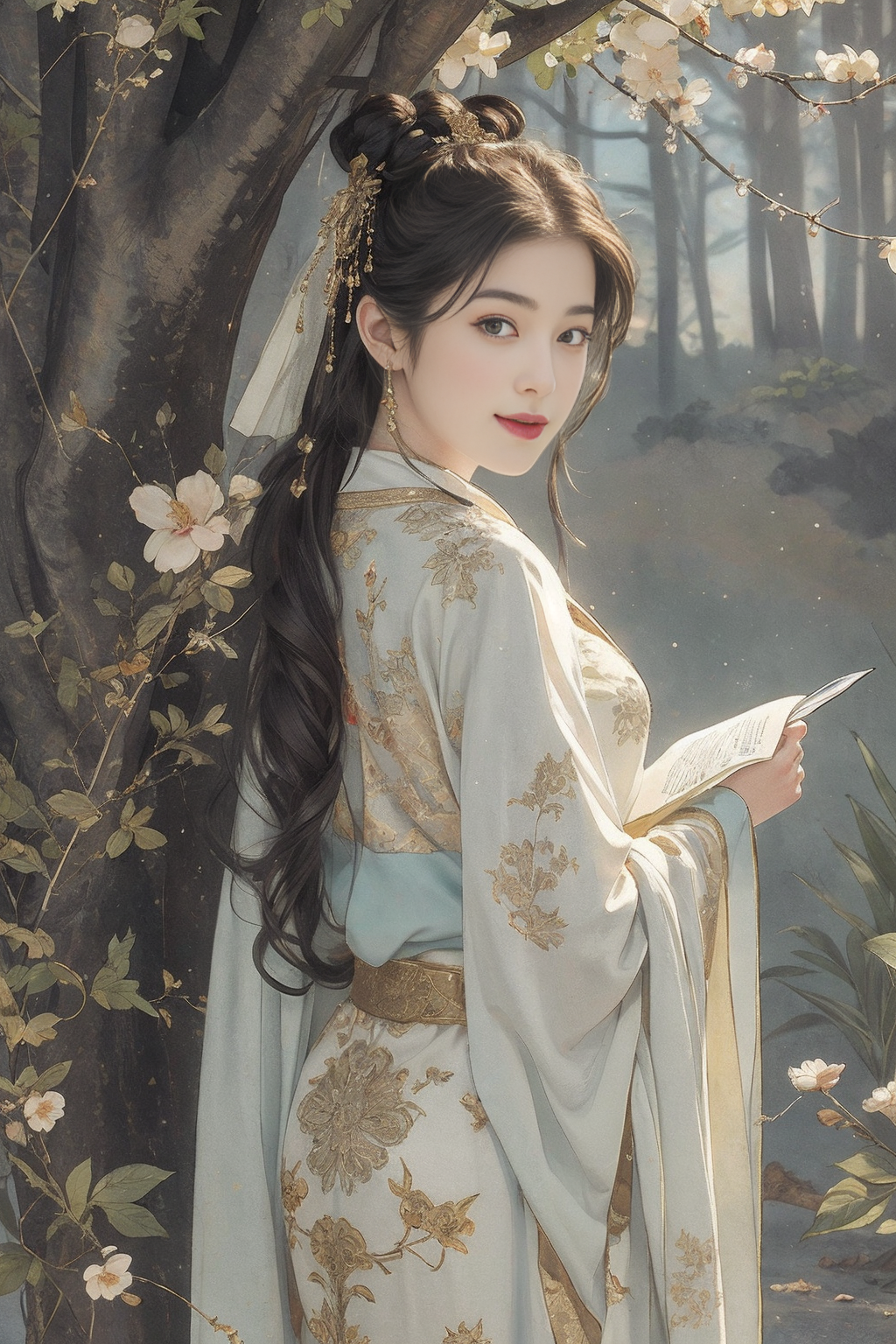 (masterpiece, best quality, ultra-detailed:1.2),1girl,perfect curves,(g0ld3mb, gold:1.1),(glimmering galaxy dress:1.1),HDR photo of young woman with a messy top bun,light brunette hair,wearing a slightly unbuttoned blouse,smiling at the viewer,holding a peach,standing in an orchard of peach trees . High dynamic range,vivid,rich details,(2D:1.3),watercolour drawing,((paper scroll)),(fantasy),(mystery),((Cinematic Lighting)),<lora:wensufan_v4:0.8>,silver foil texture,linen texture,black gold,figure,jewelry,flower,tree,<lora:wenfun_v222:1>,