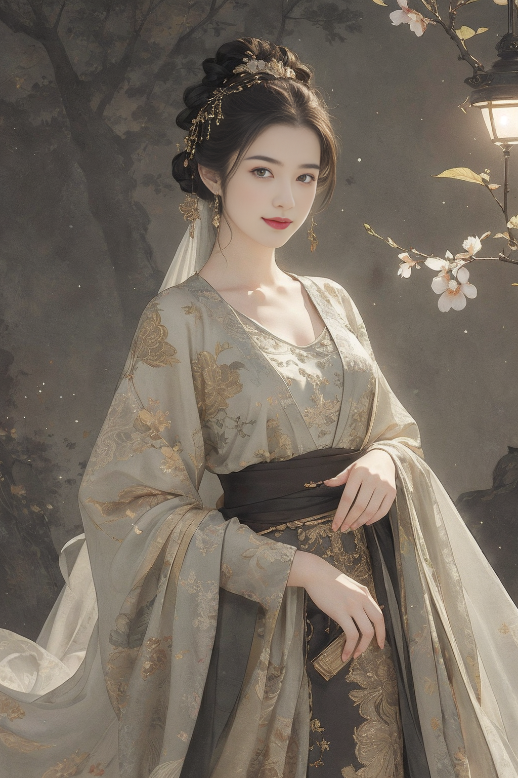 (masterpiece, best quality, ultra-detailed:1.2),1girl,perfect curves,(g0ld3mb, gold:1.1),(glimmering galaxy dress:1.1),HDR photo of young woman with a messy top bun,light brunette hair,wearing a slightly unbuttoned blouse,smiling at the viewer,holding a peach,standing in an orchard of peach trees . High dynamic range,vivid,rich details,(2D:1.3),watercolour drawing,((paper scroll)),(fantasy),(mystery),((Cinematic Lighting)),<lora:wensufan_v4:0.8>,silver foil texture,linen texture,black gold,figure,jewelry,flower,tree,<lora:wenfun_v222:1>,