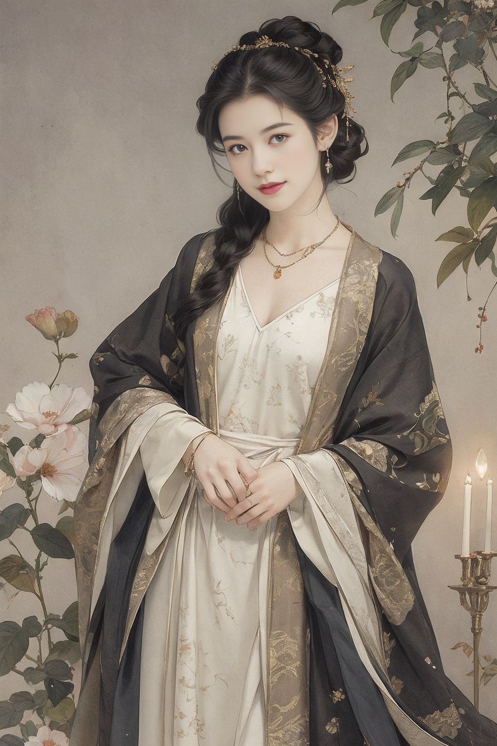 (masterpiece, best quality, ultra-detailed:1.2),1girl,perfect curves,(g0ld3mb, gold:1.1),(glimmering galaxy dress:1.1),HDR photo of young woman with a messy top bun,light brunette hair,wearing a slightly unbuttoned blouse,smiling at the viewer,holding a peach,standing in an orchard of peach trees . High dynamic range,vivid,rich details,(2D:1.3),watercolour drawing,((paper scroll)),(fantasy),(mystery),((Cinematic Lighting)),<lora:wensufan_v4:0.8>,silver foil texture,linen texture,black gold,figure,jewelry,flower,tree,<lora:wenfun_v222:1>,