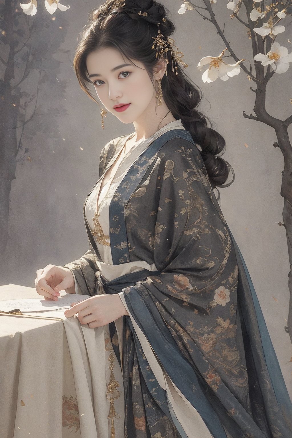 (masterpiece, best quality, ultra-detailed:1.2),1girl,perfect curves,(g0ld3mb, gold:1.1),(glimmering galaxy dress:1.1),HDR photo of young woman with a messy top bun,light brunette hair,wearing a slightly unbuttoned blouse,smiling at the viewer,holding a peach,standing in an orchard of peach trees . High dynamic range,vivid,rich details,(2D:1.3),watercolour drawing,((paper scroll)),(fantasy),(mystery),((Cinematic Lighting)),<lora:wensufan_v4:0.8>,silver foil texture,linen texture,black gold,figure,jewelry,flower,tree,<lora:wenfun_v222:1>,