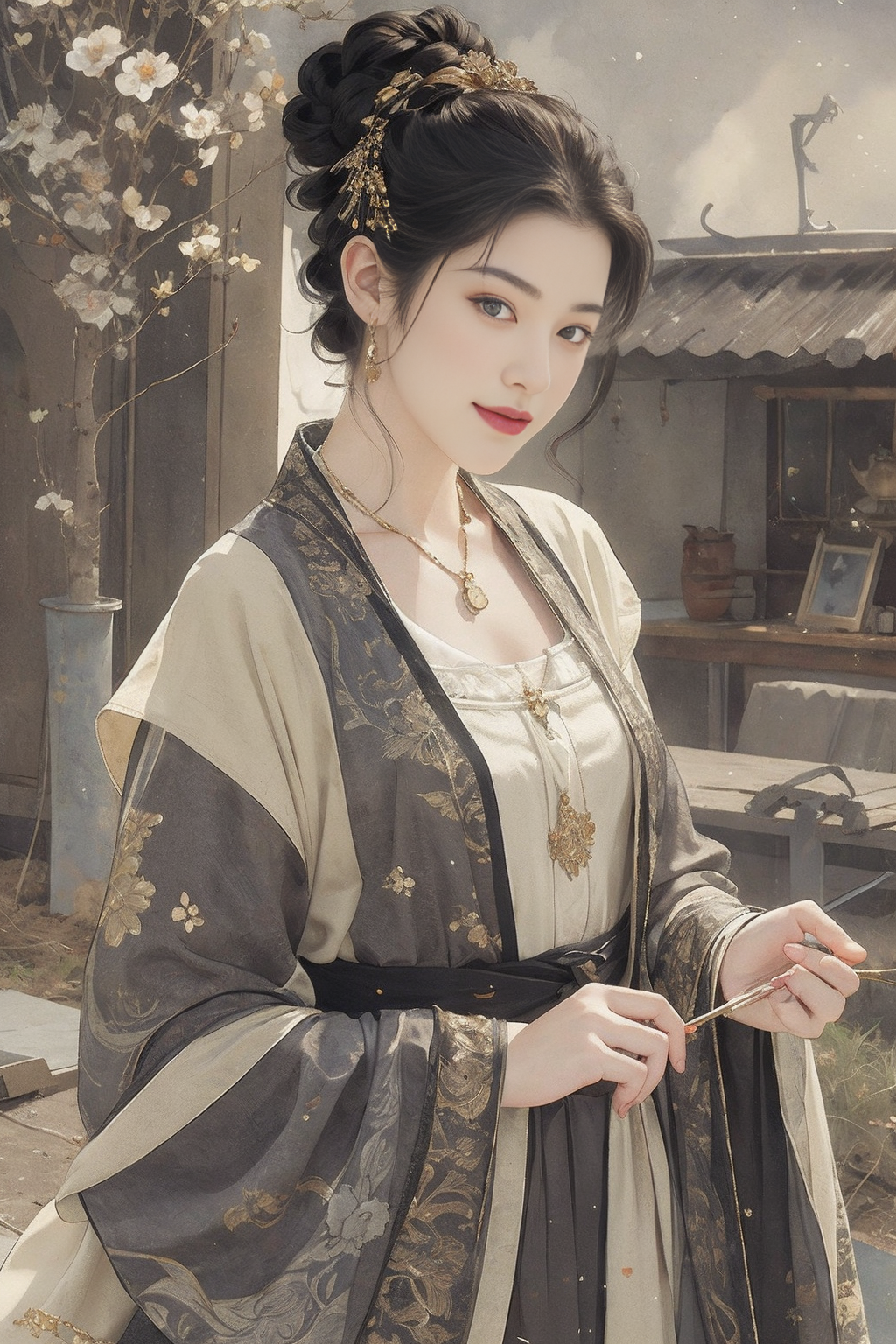 (masterpiece, best quality, ultra-detailed:1.2),1girl,perfect curves,(g0ld3mb, gold:1.1),(glimmering galaxy dress:1.1),HDR photo of young woman with a messy top bun,light brunette hair,wearing a slightly unbuttoned blouse,smiling at the viewer,holding a peach,standing in an orchard of peach trees . High dynamic range,vivid,rich details,(2D:1.3),watercolour drawing,((paper scroll)),(fantasy),(mystery),((Cinematic Lighting)),<lora:wensufan_v4:0.8>,silver foil texture,linen texture,black gold,figure,jewelry,flower,tree,<lora:wenfun_v222:1>,