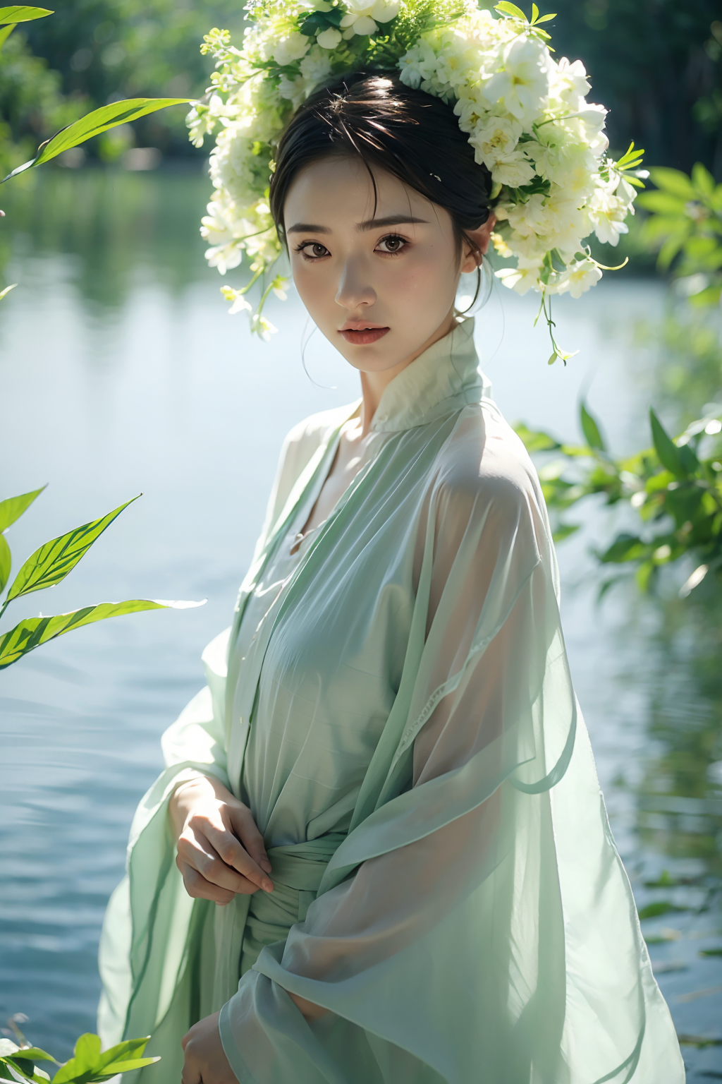 1girl,solo,<lora:milu竹éµç°ªè±:0.7>,hanfu,water front,water,zy,green hair flower,, Best quality, masterpiece, ultra high res, (photorealistic:1.4),, Movies, sense of scale and narrative, stunning contrast and shadows, 8k, photography, hyperdetail, surrealism, masterpieces, depth of field, superlight compensation, caustics,