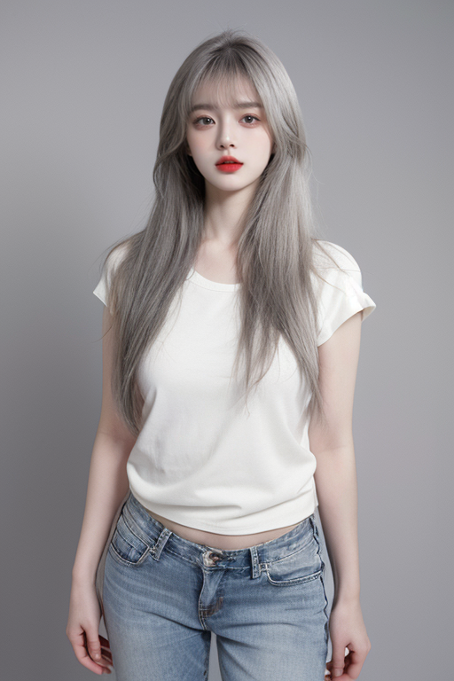 masterpiece, best quality,standing ,cute girl,big eye,beautiful eye,white t-shirt,jeans,(big boost:1.2),gray hair,bangs,pure gray background<lora:fashigirl-v7-lokr-7ep:0.8> <lora:taiwanDollLikeness_v20:0.4> <lora:saggy:1> saggy