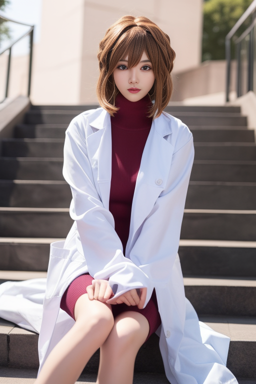 ltra-detailed,highly detailed,best quality,masterpiece,illustration, drawing, realistic, photorealistic, haibara, 1girl, solo, cosplay, labcoat, sweater dress, sleeves past wrists, turtleneck, brown hair, short hair, bangs, hair between eyes, looking at viewer, sitting, outdoors, photo background, stairs, <lora:haibara_v1_06:0.9>
