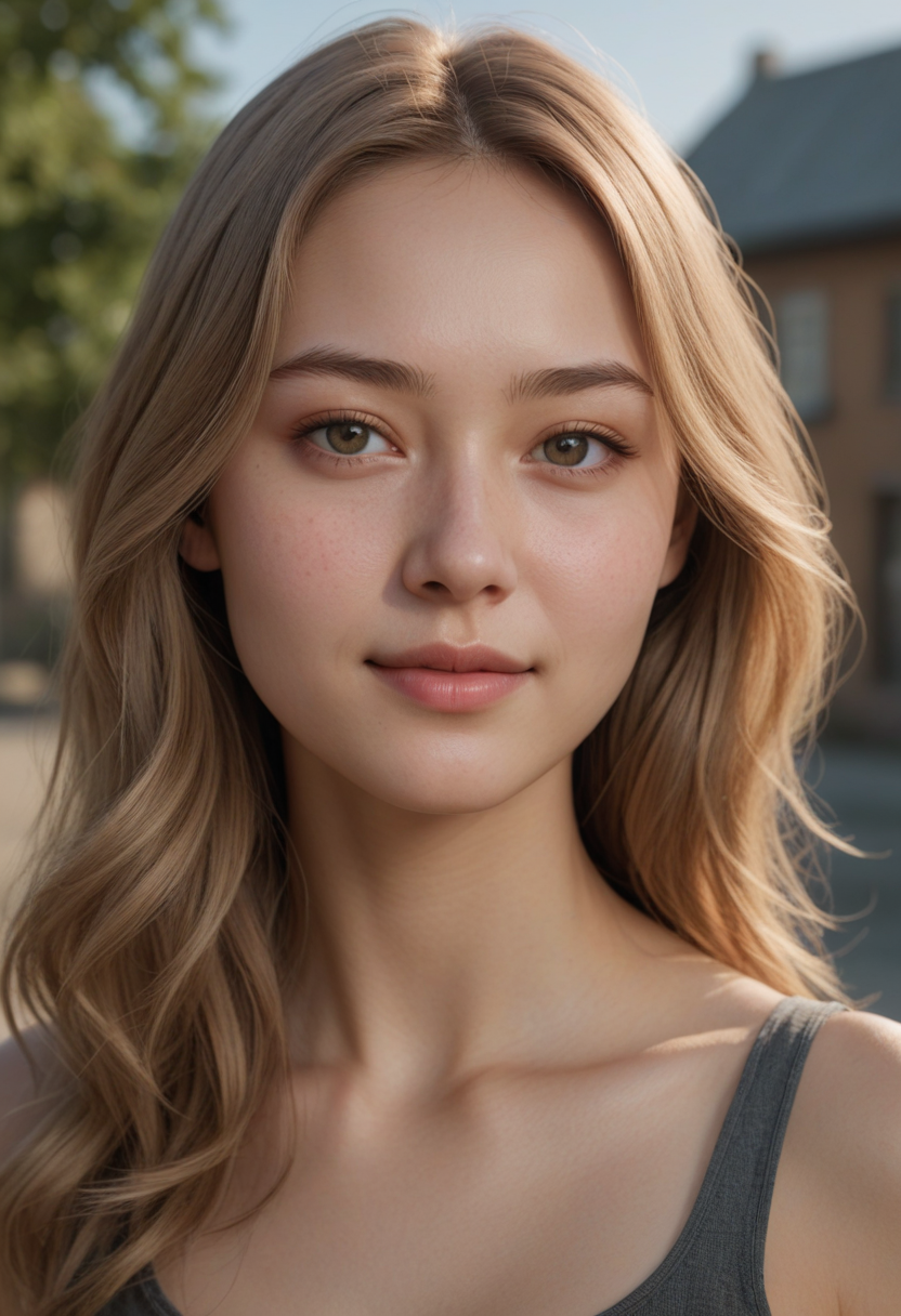 realistic image of a half-Russian-Korean girl with fair skin with natural, balanced features. Her face has a soft, oval shape with smooth skin and a gentle expression. Her eyes are almond-shaped, clear, and attentive, framed by naturally arched eyebrows. Her nose is proportionate to her face, neither too small nor too prominent. Her lips are natural and relaxed, forming a subtle smile. Her hair falls in loose, realistic waves around her shoulders, with a rich, natural colour a honey blonde. The texture appears soft and slightly tousled as if moved by a light breeze. The girl's posture is relaxed yet poised, with her shoulders at ease and her head tilted slightly to one side. She's wearing a simple. high quality, hyperrealistic, cinematic lighting, depth of field, 8k resolution