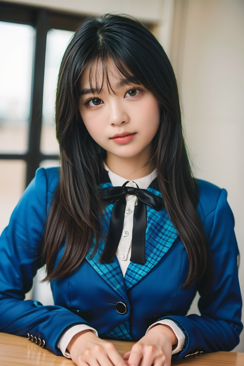 masterpiece,intricate,upper body,depth of field,best quality,1girl,solo,plump,smile,asian,white skin,21y.o,beautiful,black hair,medium hair,looking into viewer,(wearing 12th single hinatazaka46 seifuku:1.3),black ribbon,blue blazer,long sleeves,plaid,collared shirt,uniform,from front,<lora:Hinatazaka46_12th_Single_Seifuku:0.9>,indoor,cafeteria,, RAW photo, subject, (high detailed skin:1.2), 8k uhd, dslr,soft lighting,high quality, film grain, Fujifilm XT3, <lora:epiNoiseoffset_v2-pynoise:1>, highres,huge filesize,HD,highest quality,best quality,highly detailed hair,proportional body,proportional breasts,beautiful breasts,highly detailed skin,goosebumps,visible pores,intricate,masterpiece,ultra high res,photorealistic,depth of field,RAW photo,best quality,realistic,photo-realistic,an extremely delicate and beautiful,CG,finely detail,absurdres,, <lora:add_detail:0.5>,add_detail
