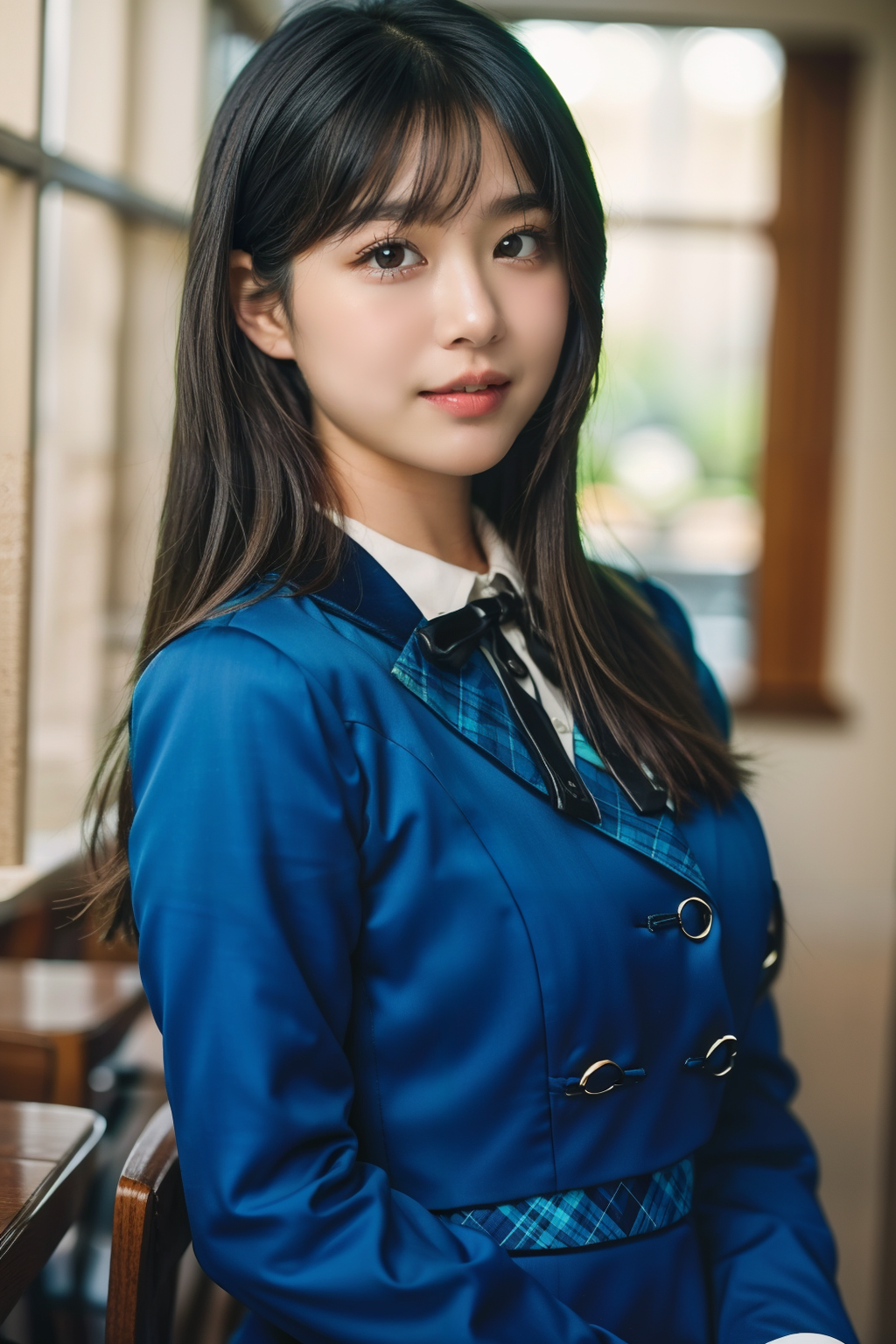 masterpiece,intricate,upper body,depth of field,best quality,1girl,solo,plump,smile,asian,white skin,21y.o,beautiful,black hair,medium hair,looking into viewer,(wearing 12th single hinatazaka46 seifuku:1.3),black ribbon,blue blazer,long sleeves,plaid,collared shirt,uniform,from front,<lora:Hinatazaka46_12th_Single_Seifuku:0.9>,indoor,cafeteria,, RAW photo, subject, (high detailed skin:1.2), 8k uhd, dslr,soft lighting,high quality, film grain, Fujifilm XT3, <lora:epiNoiseoffset_v2-pynoise:1>, highres,huge filesize,HD,highest quality,best quality,highly detailed hair,proportional body,proportional breasts,beautiful breasts,highly detailed skin,goosebumps,visible pores,intricate,masterpiece,ultra high res,photorealistic,depth of field,RAW photo,best quality,realistic,photo-realistic,an extremely delicate and beautiful,CG,finely detail,absurdres,, <lora:add_detail:0.5>,add_detail